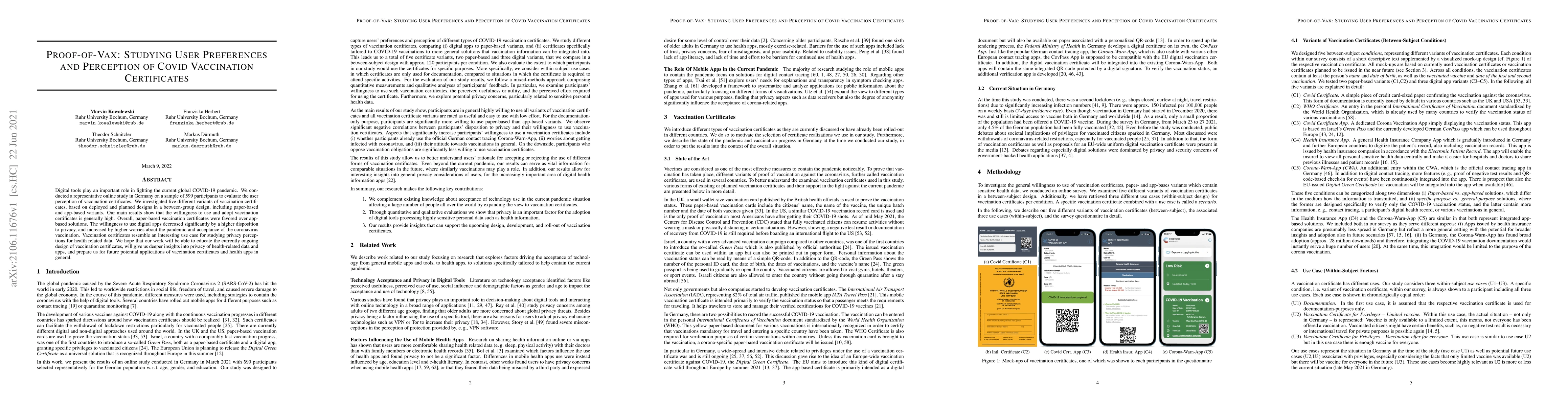 A study of 599 participants in Germany found that paper-based vaccination certificates were preferred over app-based solutions, with willingness to use decreasing with increasing privacy concerns.