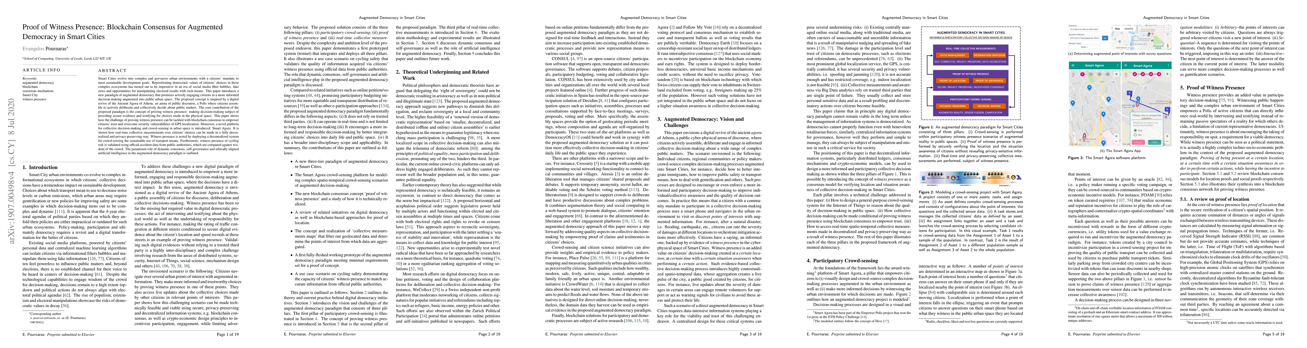 Smart Cities evolve into complex and pervasive urban environments with a citizens' mandate to meet sustainable development goals. Repositioning democratic values of citizens' choices in these complex ecosystems has turned out to be imperative in an era of social media filter bubbles, fake news and opportunities for manipulating electoral results with such means. This paper introduces a new paradigm of augmented democracy that promises actively engaging citizens in a more informed decision-making augmented into public urban space. The proposed concept is inspired by a digital revive of the Ancient Agora of Athens, an arena of public discourse, a Polis where citizens assemble to actively deliberate and collectively decide about public matters. The core contribution of the proposed paradigm is the concept of proving witness presence: making decision-making subject of providing secure evidence and testifying for choices made in the physical space. This paper shows how the challenge of proving witness presence can be tackled with blockchain consensus to empower citizens' trust and overcome security vulnerabilities of GPS localization. Moreover, a novel platform for collective decision-making and crowd-sensing in urban space is introduced: Smart Agora. It is shown how real-time collective measurements over citizens' choices can be made in a fully decentralized and privacy-preserving way. Witness presence is tested by deploying a decentralized system for crowd-sensing the sustainable use of transport means. Furthermore, witness presence of cycling risk is validated using official accident data from public authorities, which are compared against wisdom of the crowd. The paramount role of dynamic consensus, self-governance and ethically aligned artificial intelligence in the augmented democracy paradigm is outlined.