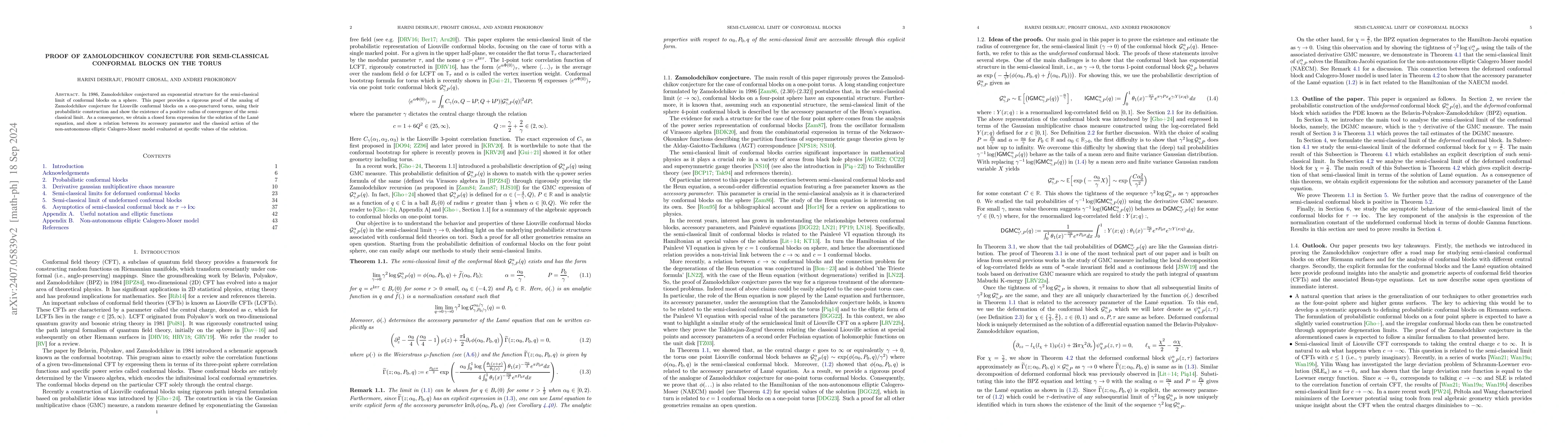 The paper rigorously proves the Zamolodchikov conjecture for semi-classical conformal blocks on a one-punctured torus, establishing a positive radius of convergence and deriving a closed form for the solution of the Lamé equation. It also connects the accessory parameter of the Lamé equation to the classical action of the elliptic Calogero-Moser model.