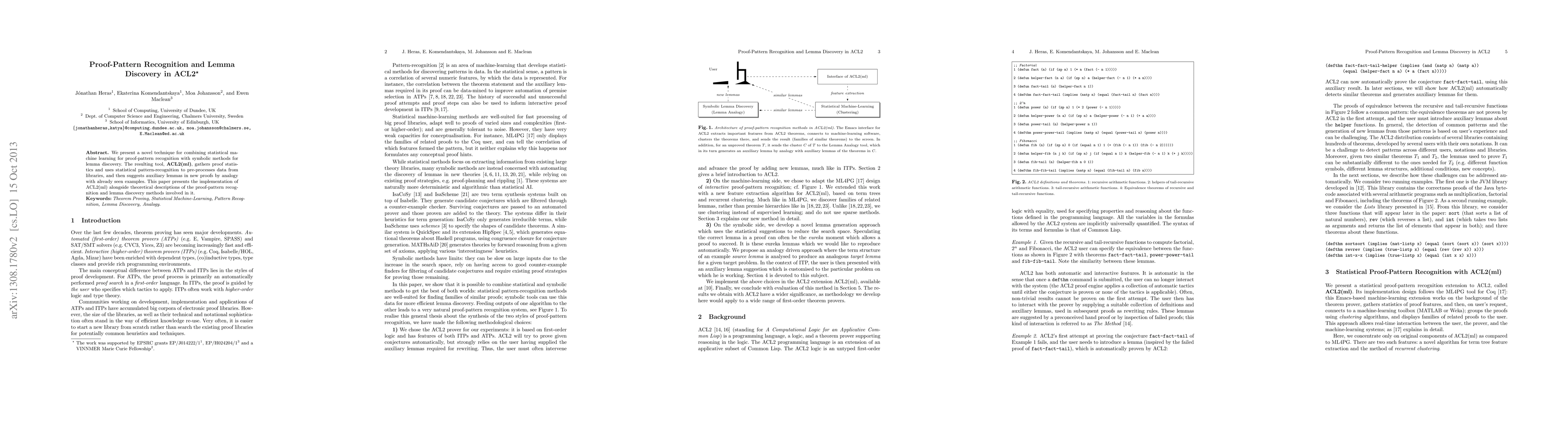 This paper introduces ACL2(ml), a tool combining machine learning for proof-pattern recognition and symbolic methods for lemma discovery to assist in automated theorem proving. The tool uses statistical pattern recognition to suggest auxiliary lemmas based on previously seen examples.