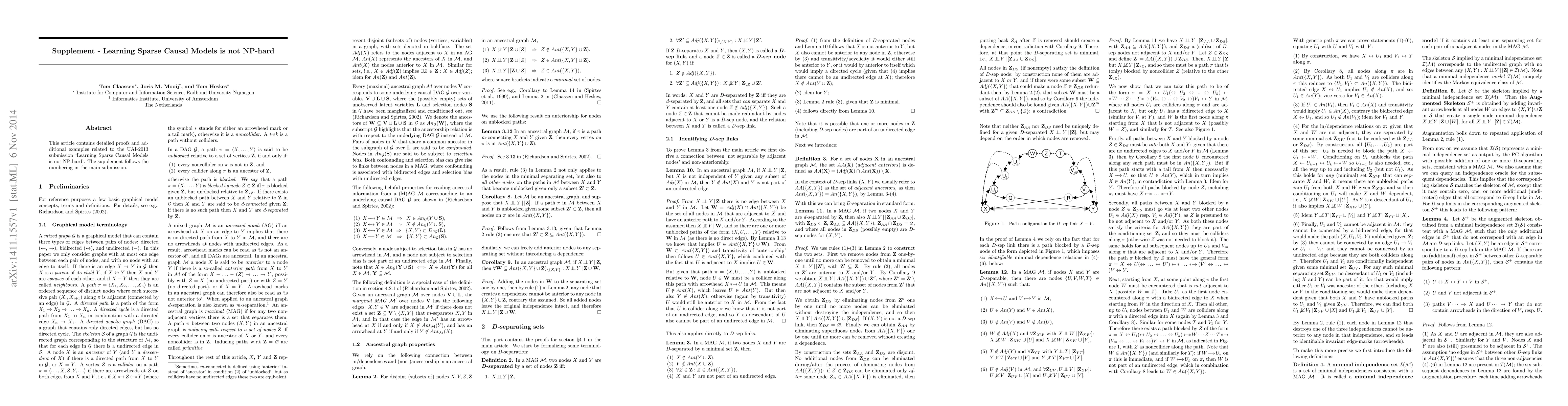 Research confirms that learning sparse causal models is not NP-hard, using an algorithm called FCI+, which has a polynomial complexity of order $N^{2(k+1)}$ in the number of independence tests for sparse graphs over N nodes.