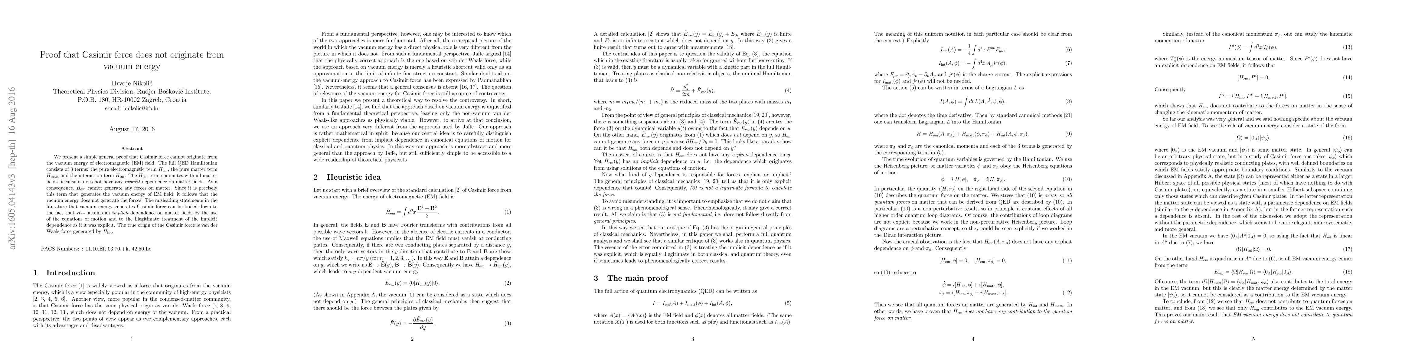 We present a simple general proof that Casimir force cannot originate from the vacuum energy of electromagnetic (EM) field. The full QED Hamiltonian consists of 3 terms: the pure electromagnetic term $H_{\rm em}$, the pure matter term $H_{\rm matt}$ and the interaction term $H_{\rm int}$. The $H_{\rm em}$-term commutes with all matter fields because it does not have any explicit dependence on matter fields. As a consequence, $H_{\rm em}$ cannot generate any forces on matter. Since it is precisely this term that generates the vacuum energy of EM field, it follows that the vacuum energy does not generate the forces. The misleading statements in the literature that vacuum energy generates Casimir force can be boiled down to the fact that $H_{\rm em}$ attains an implicit dependence on matter fields by the use of the equations of motion and the illegitimate treatment of the implicit dependence as if it was explicit. The true origin of the Casimir force is van der Waals force generated by $H_{\rm int}$.