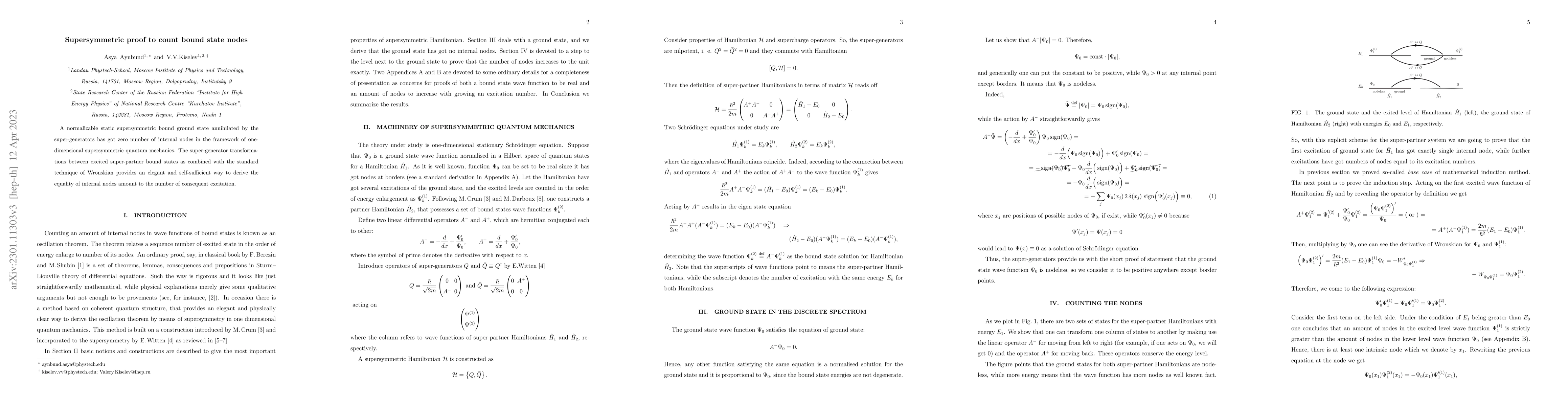 Summary: This paper demonstrates that a supersymmetric bound ground state in one-dimensional quantum mechanics has zero internal nodes. It utilizes super-generator transformations and Wronskian techniques to elegantly derive the equality between the number of internal nodes and the number of consecutive excitations.