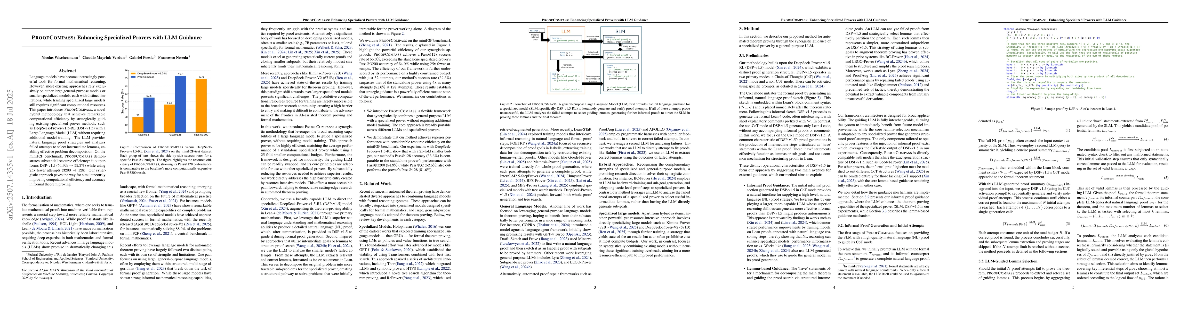 Language models have become increasingly powerful tools for formal mathematical reasoning. However, most existing approaches rely exclusively on either large general-purpose models or smaller specialized models, each with distinct limitations, while training specialized large models still requires significant computational resources. This paper introduces ProofCompass, a novel hybrid methodology that achieves remarkable computational efficiency by strategically guiding existing specialized prover methods, such as DeepSeek-Prover-v1.5-RL (DSP-v1.5) with a Large Language Model (LLM) without requiring additional model training. The LLM provides natural language proof strategies and analyzes failed attempts to select intermediate lemmas, enabling effective problem decomposition. On the miniF2F benchmark, ProofCompass demonstrates substantial resource efficiency: it outperforms DSP-v1.5 ($54.9\% \rightarrow 55.3\%$) while using 25x fewer attempts ($3200 \rightarrow 128$). Our synergistic approach paves the way for simultaneously improving computational efficiency and accuracy in formal theorem proving.