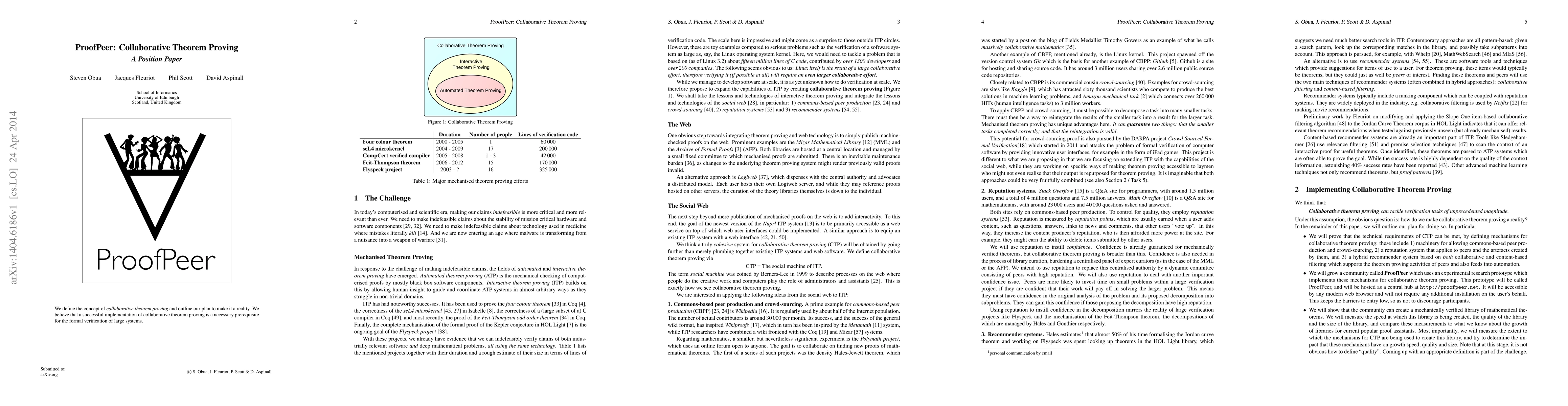 Summary: ProofPeer introduces the concept of collaborative theorem proving, aiming to facilitate joint verification efforts for large systems. This approach is seen as essential for the formal verification of complex systems through collective expertise.