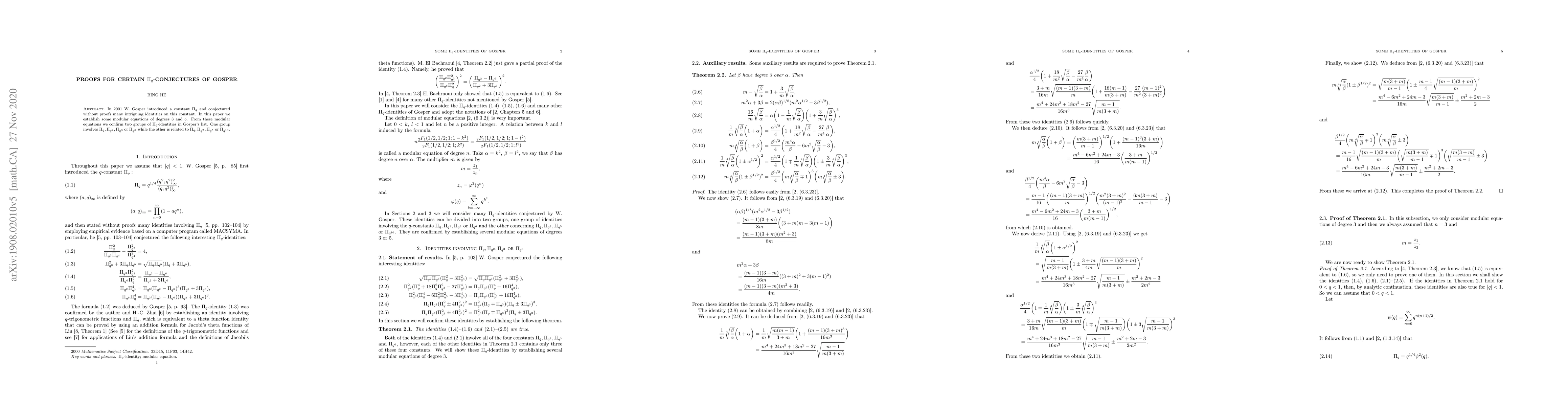 This paper confirms two groups of conjectured identities for Gosper's Pi_{q} constant by establishing modular equations of degrees 3 and 5, thereby validating several of Gosper's proposed identities.