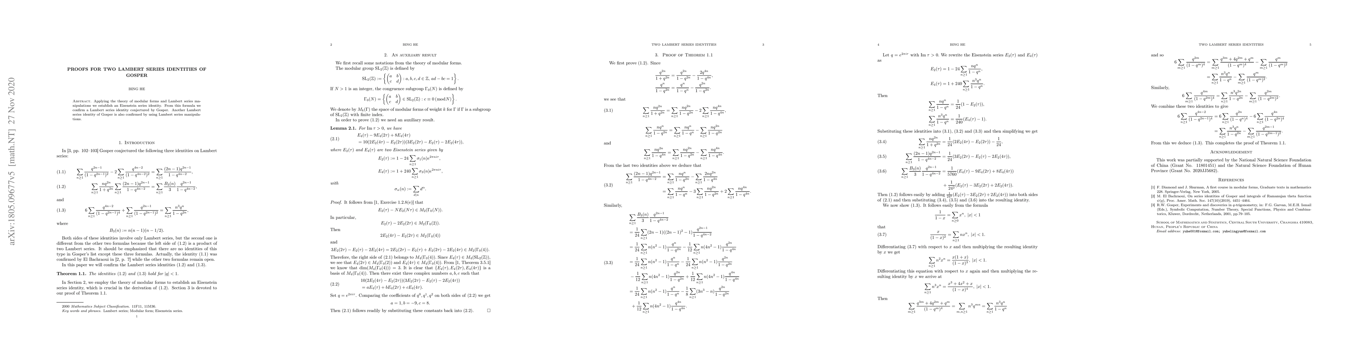 This paper establishes two Lambert series identities conjectured by Gosper through the application of modular forms and Lambert series manipulations, confirming both identities.