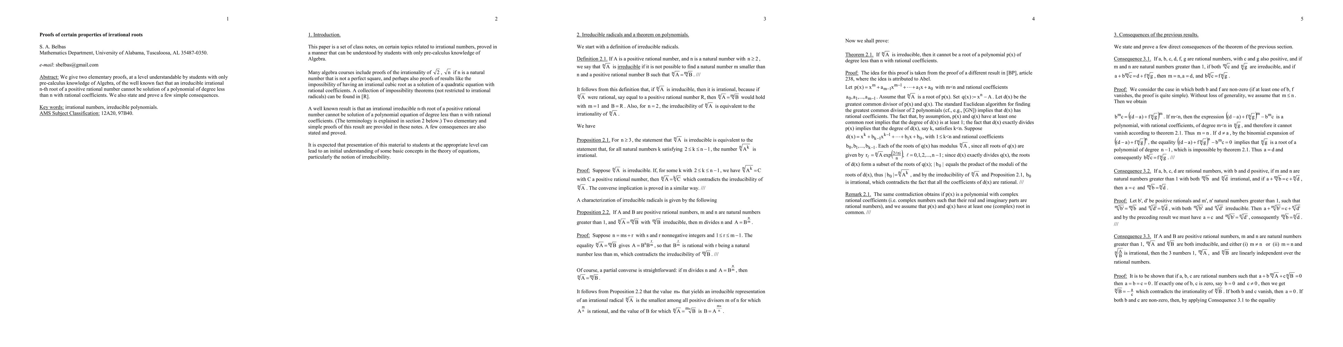 This paper provides two accessible proofs for the theorem that an irreducible irrational n-th root of a positive rational number cannot solve a polynomial of degree less than n with rational coefficients, and it also explores some straightforward consequences of this result.