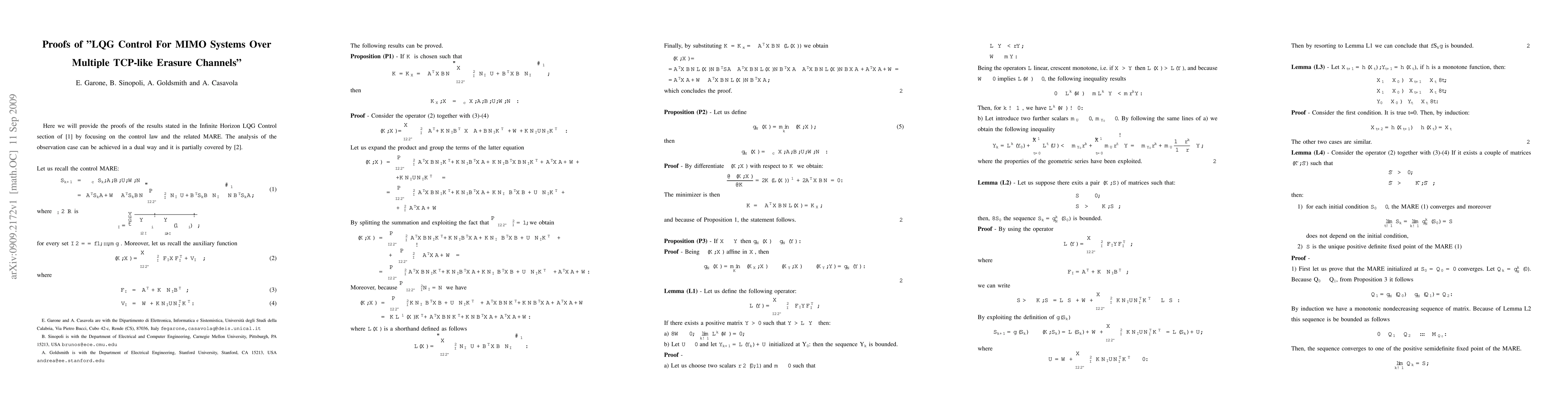Here we will provide the proofs of the results stated in the Infinite Horizon LQG Control section of [1] by focusing on the control law and the related MARE. The analysis of the observation case can be achieved in a dual way and it is partially covered by [2].