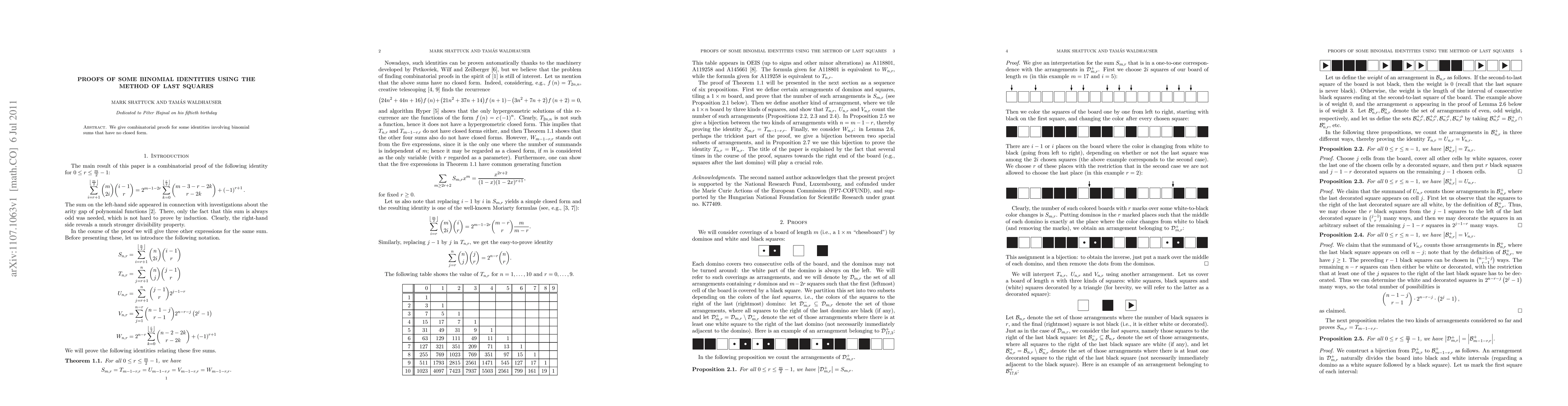 Summary: This paper provides combinatorial proofs for certain binomial identities involving sums that lack closed forms, utilizing the method of last squares to establish the results.