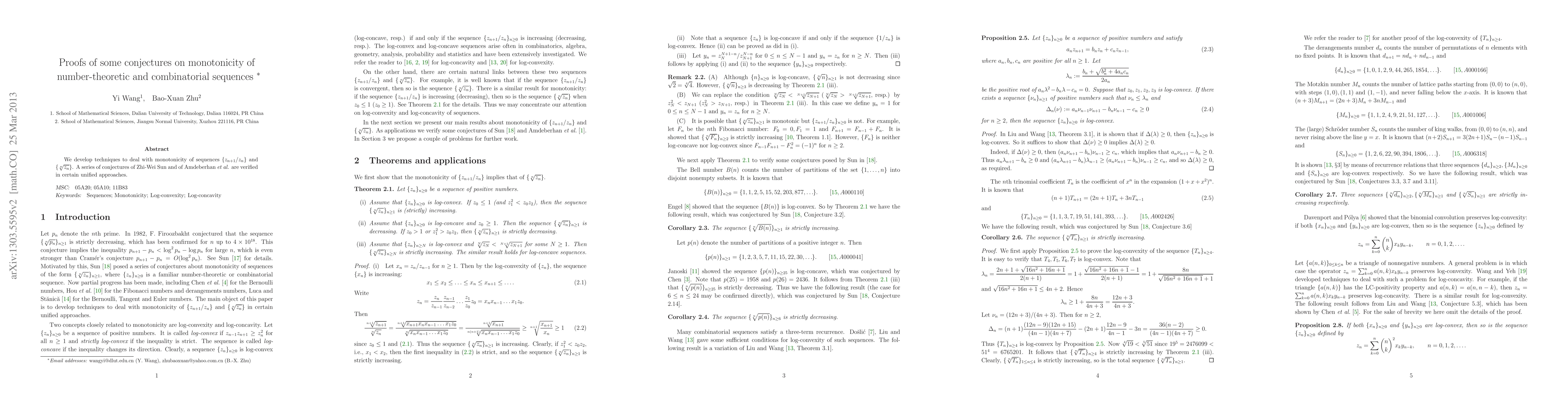 Two-line summary: This paper develops new techniques to analyze the monotonicity of number-theoretic and combinatorial sequences. It verifies several conjectures related to sequences \( z_{n+1}/z_n \) and \( \sqrt[n]{z_n} \), providing unified approaches to support these findings.