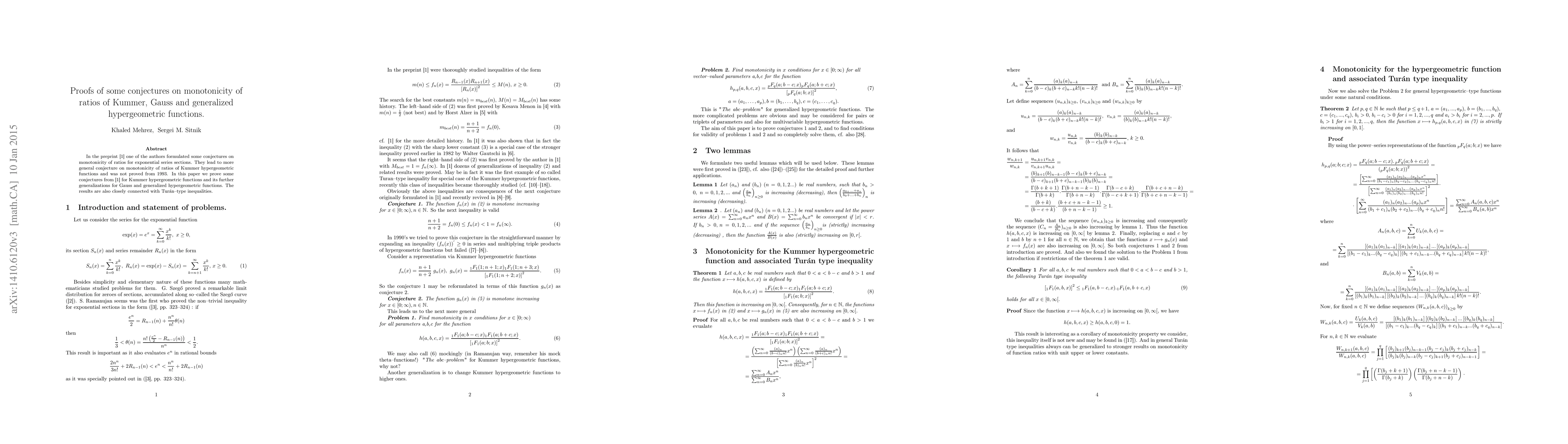 In 1993 one of the authors formulated some conjectures on monotonicity of ratios for exponential series sections. They lead to more general conjecture on monotonicity of ratios of Kummer hypergeometric functions and was not proved from 1993. In this paper we prove these conjectures in the more general setting for Kummer hypergeometric functions and its further generalizations for Gauss and generalized hypergeometric functions. The results are also closely connected with Turan--type inequalities.