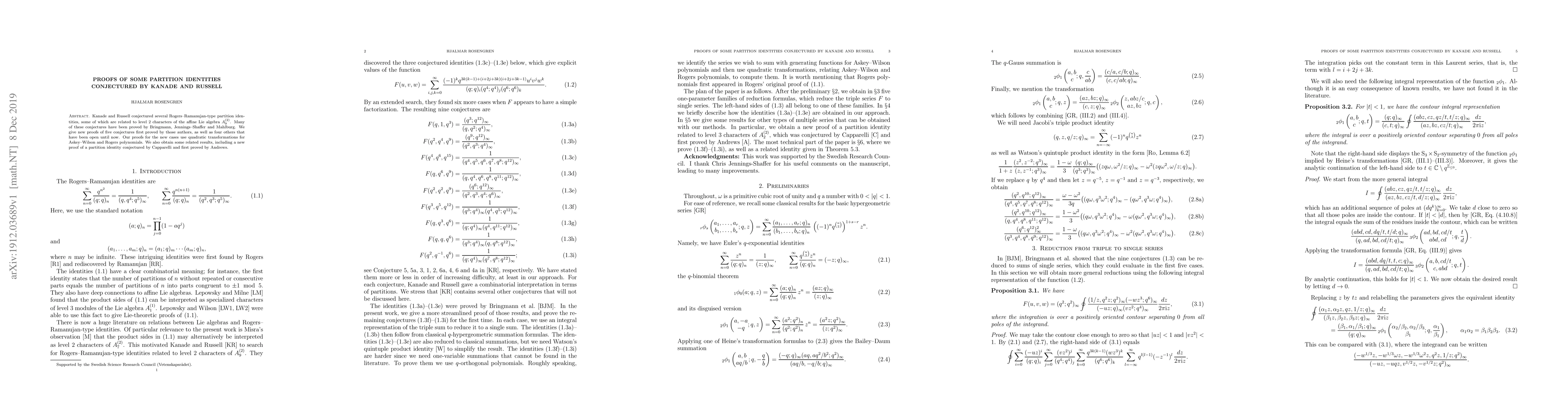 Kanade and Russell conjectured several Rogers-Ramanujan-type partition identities, some of which are related to level $2$ characters of the affine Lie algebra $A_9^{(2)}$. Many of these conjectures have been proved by Bringmann, Jennings-Shaffer and Mahlburg. We give new proofs of five conjectures first proved by those authors, as well as four others that have been open until now. Our proofs for the new cases use quadratic transformations for Askey-Wilson and Rogers polynomials. We also obtain some related results, including a new proof of a partition identity conjectured by Capparelli and first proved by Andrews.