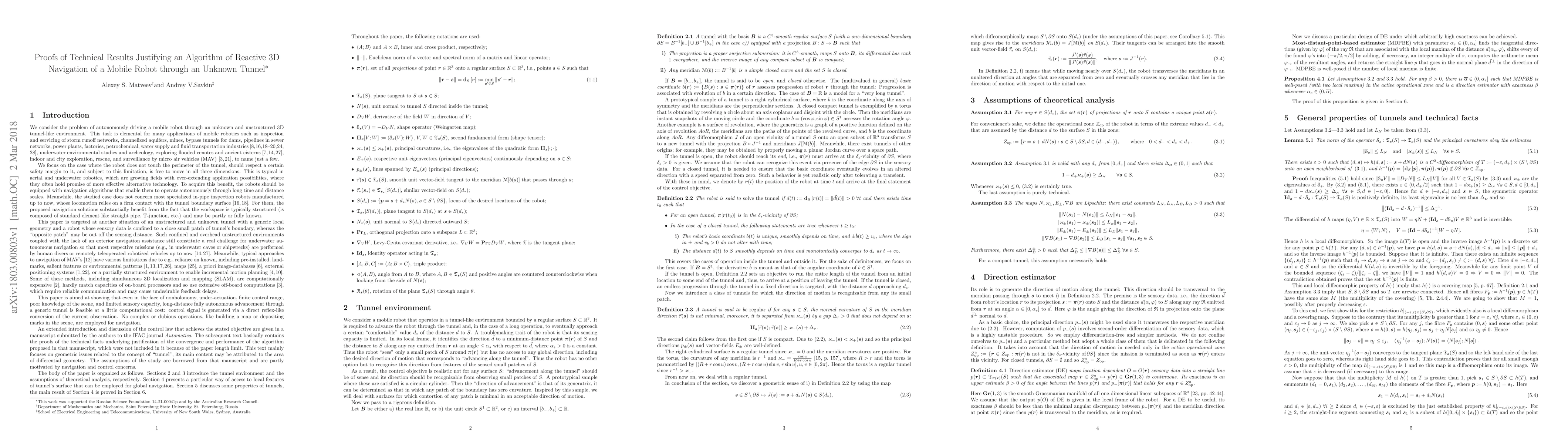 This paper provides mathematical proofs supporting a new navigation algorithm for a nonholonomic mobile robot navigating through an unknown 3D tunnel. It ensures the robot maintains a safe distance from the tunnel walls while constantly progressing towards a designated point.