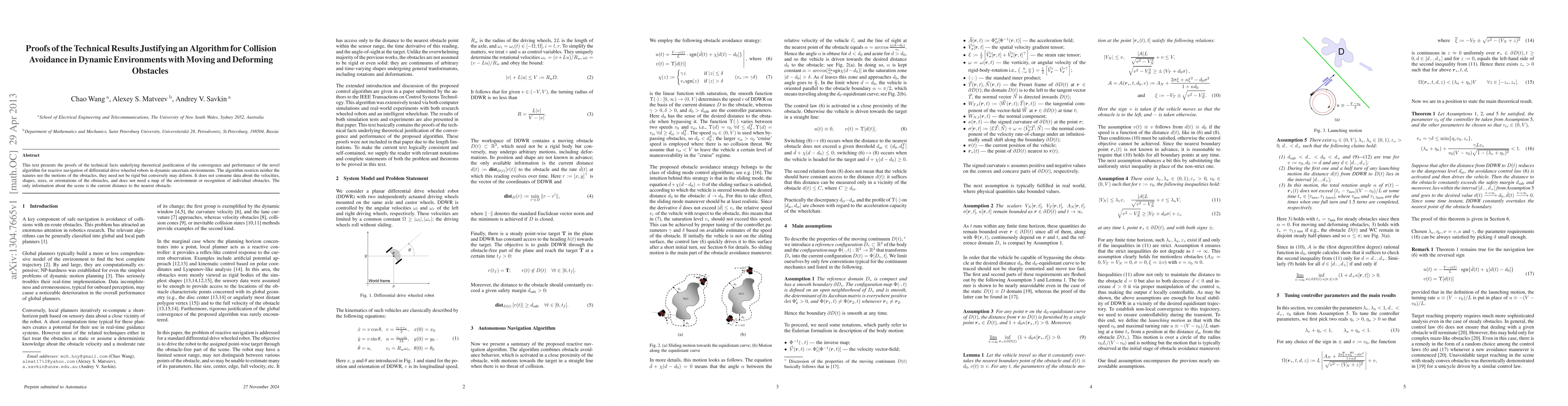 This text presents the proofs of the technical facts underlying theoretical justification of the convergence and performance of the novel algorithm for reactive navigation of differential drive wheeled robots in dynamic uncertain environments. The algorithm restricts neither the natures nor the motions of the obstacles, they need not be rigid but conversely may deform. It does not consume data about the velocities, shapes, sizes, or orientations of the obstacles, and does not need a map of the environment or recognition of individual obstacles. The only information about the scene is the current distance to the nearest obstacle.