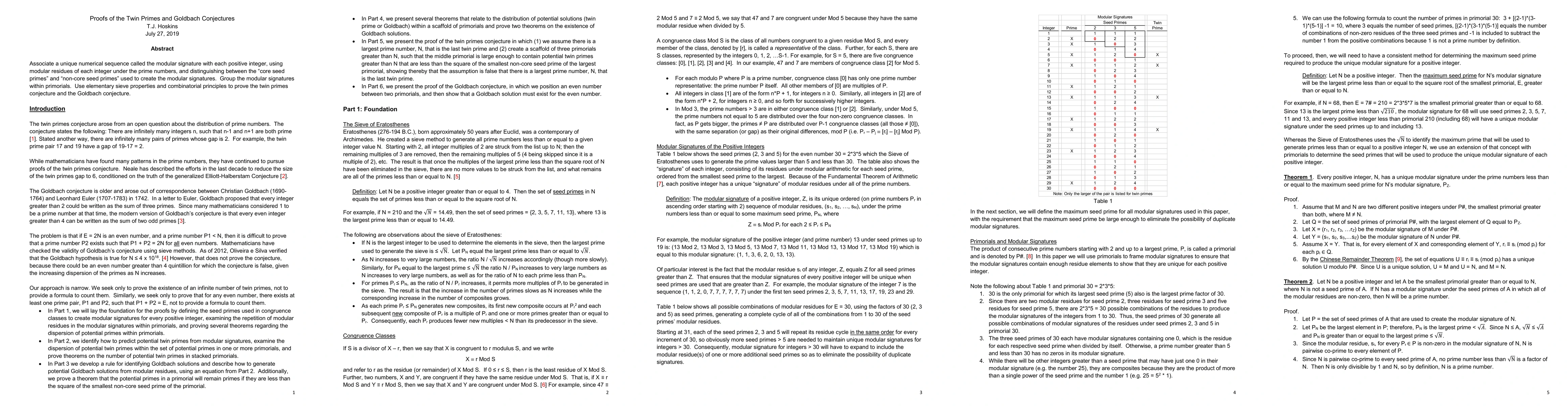 The paper proposes a novel method to associate modular signatures with positive integers, using prime residues and categorizing core and non-core seed primes, to group these signatures within primorials, and employs elementary sieve methods and combinatorial principles to prove the twin primes and Goldbach conjectures.