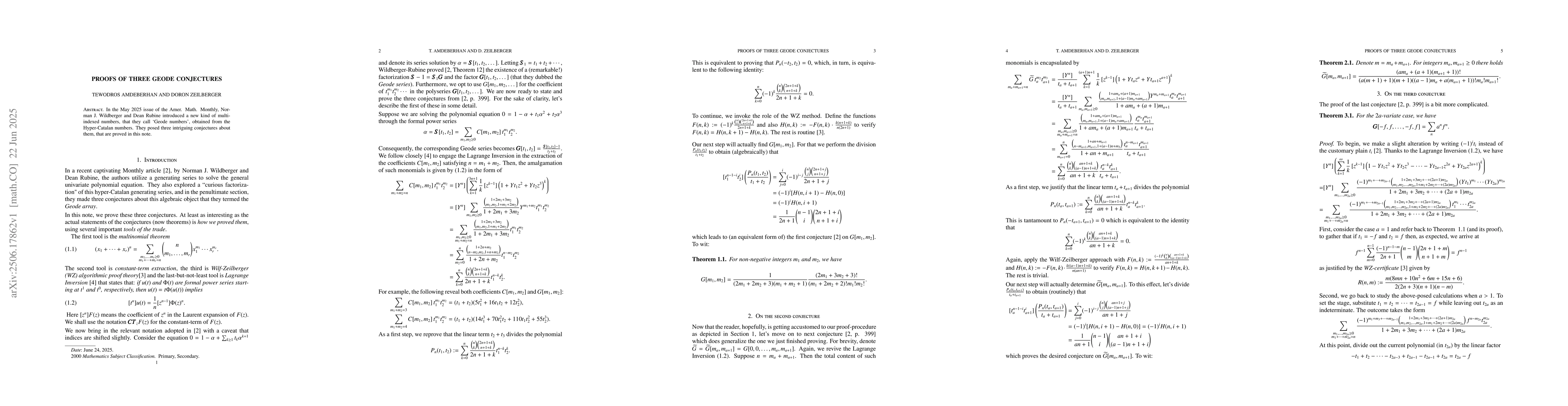 In the May 2025 issue of the Amer. Math. Monthly, Norman J. Wildberger and Dean Rubine intoduced a new kind of multi-indexed numbers, that they call `Geode numbers', obtained from the Hyper-Catalan numbers. They posed three intriguing conjectures about them, that are proved in this note.