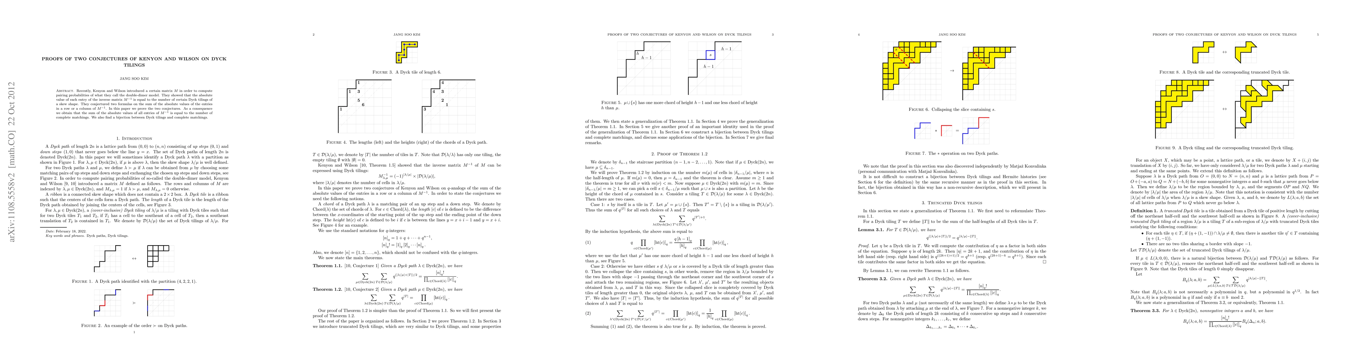 This paper proves two conjectures of Kenyon and Wilson regarding the double-dimer model's matrix M. The proofs establish formulas for summing absolute values of entries in M^-1 rows/columns, showing this sum equals the number of complete matchings. A bijection between Dyck tilings and complete matchings is also found.