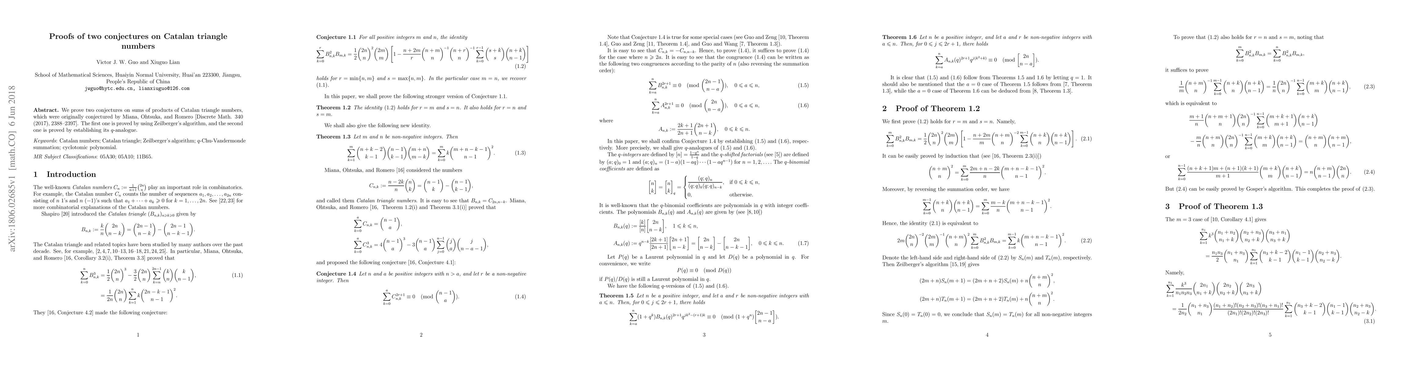 This paper proves two conjectures regarding sums of products of Catalan triangle numbers, originally proposed by Miana, Ohtsuka, and Romero. The first conjecture is verified using Zeilberger's algorithm, while the second is confirmed by establishing its $q$-analogue.