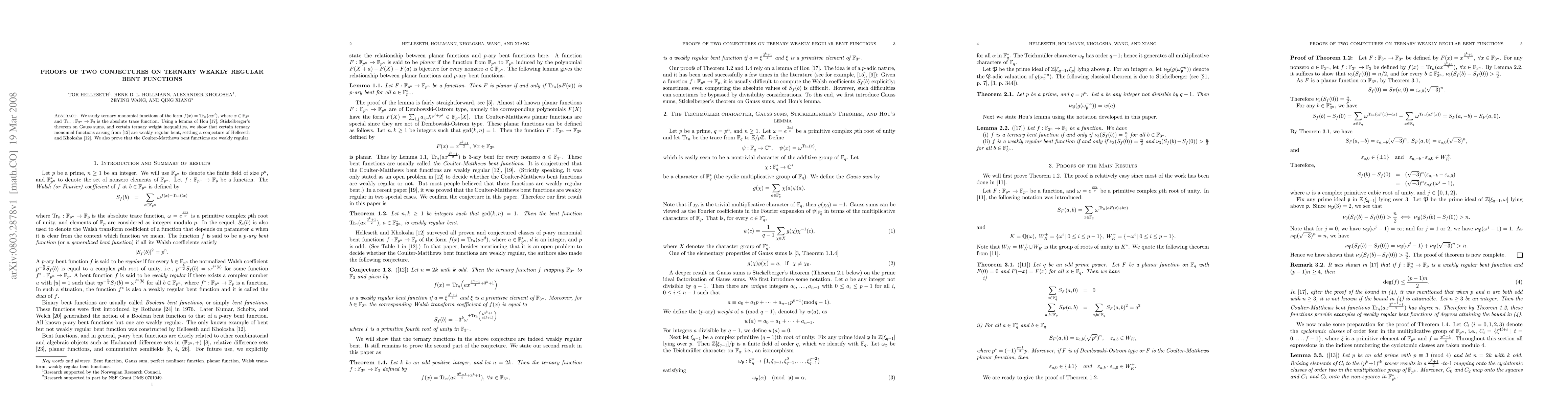This paper proves two conjectures regarding ternary weakly regular bent functions. It demonstrates that certain ternary monomial functions are weakly regular bent using a combination of Hou's lemma, Stickelberger's theorem, and ternary weight inequalities, and also confirms the weak regularity of Coulter-Matthews bent functions.