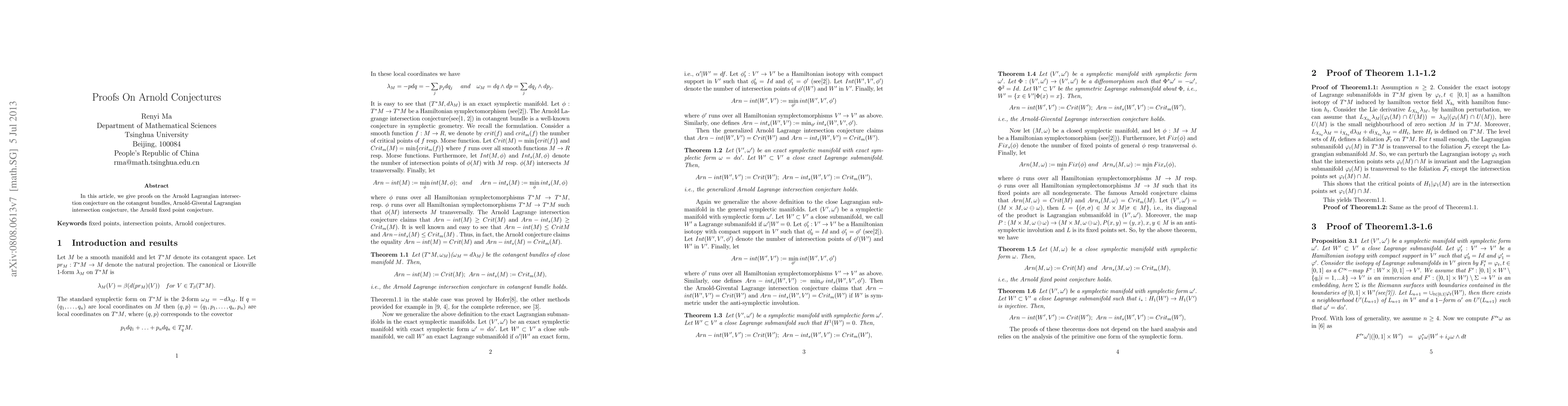 In this article, we give proofs on the Arnold Lagrangian intersection conjecture on the cotangent bundles, Arnold-Givental Lagrangian intersection conjecture and the Arnold fixed point conjecture.