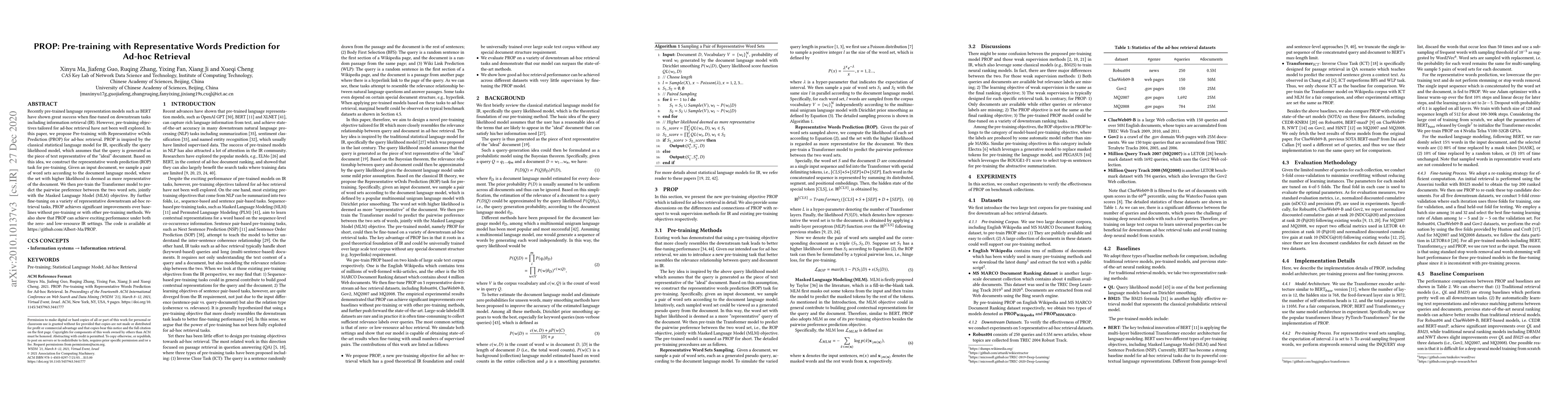 This paper introduces PROP, a pre-training method for ad-hoc information retrieval that utilizes a representative words prediction (ROP) task, inspired by the query likelihood model. PROP pre-trains Transformer models to predict the preference between word sets from documents, achieving notable improvements in retrieval tasks compared to baselines.