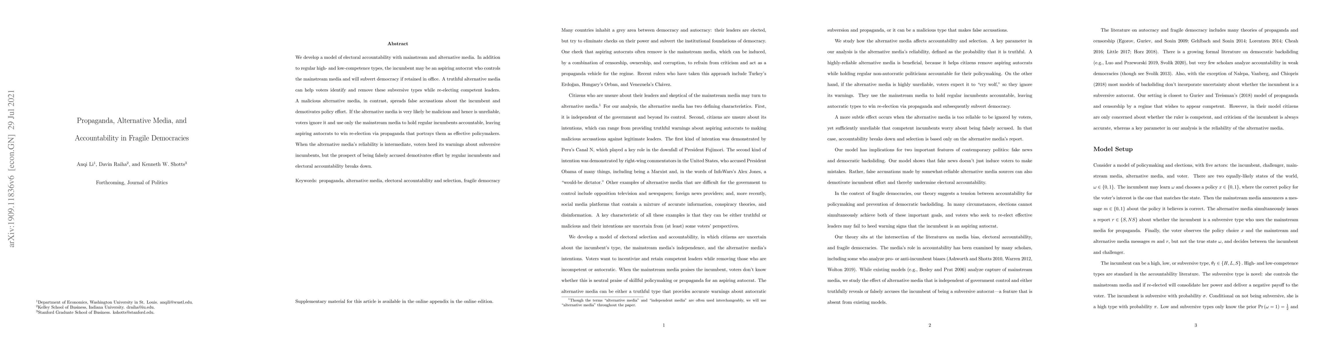 This paper models electoral accountability in fragile democracies with both mainstream and alternative media, showing how a reliable alternative media can help voters identify and remove aspiring autocrats, while a malicious one undermines accountability by spreading false accusations and discouraging competent incumbents.