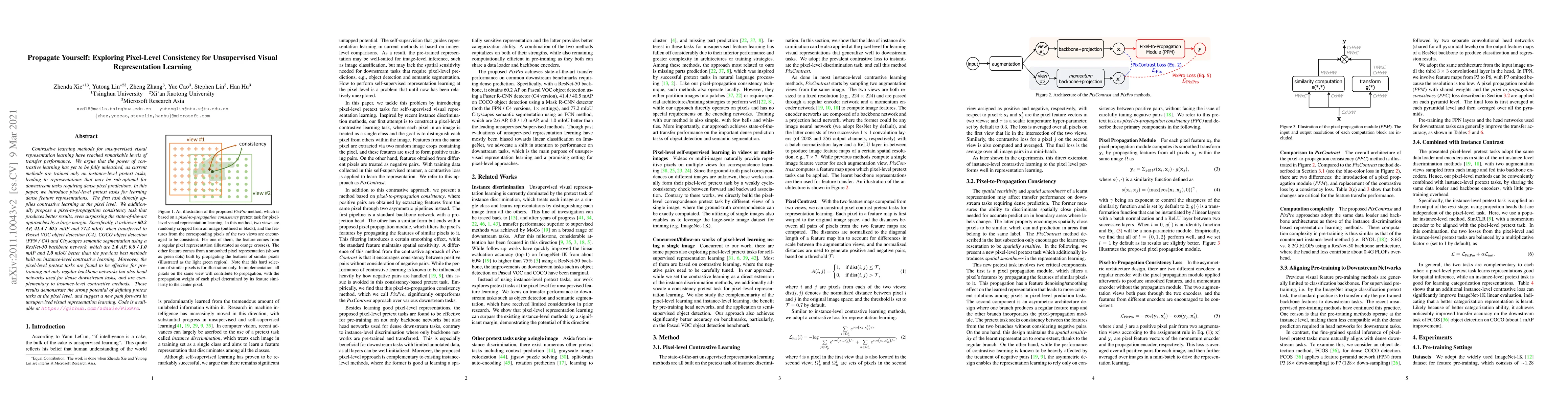 This paper proposes pixel-level pretext tasks for unsupervised visual representation learning to achieve better dense feature representations. The introduced pixel-to-propagation consistency task outperforms state-of-the-art methods, achieving superior results in object detection and semantic segmentation tasks.