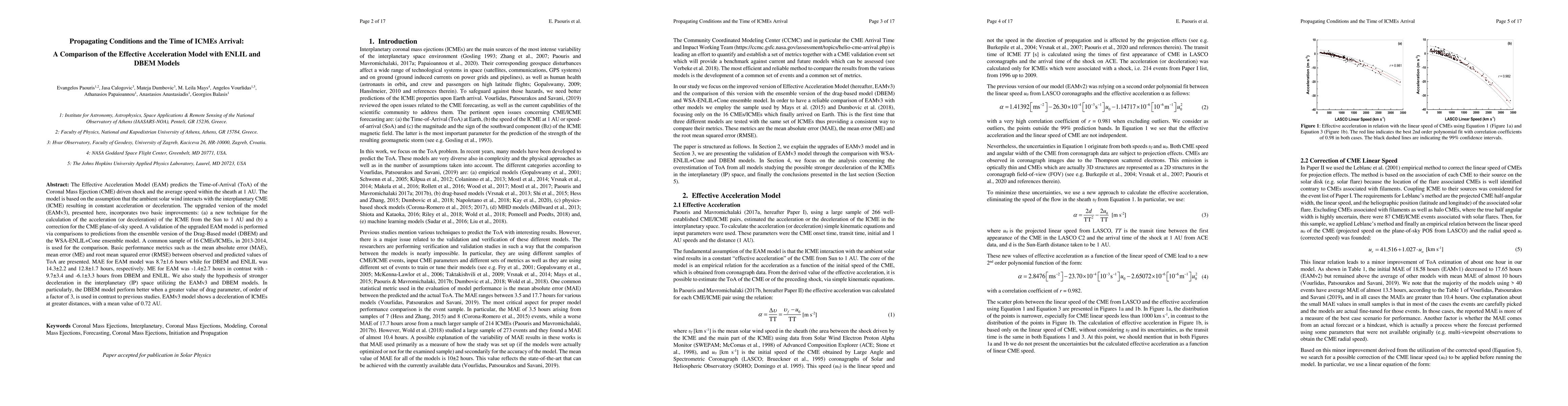 The Effective Acceleration Model (EAM) predicts the Time-of-Arrival (ToA) of the Coronal Mass Ejection (CME) driven shock and the average speed within the sheath at 1 AU. The model is based on the assumption that the ambient solar wind interacts with the interplanetary CME (ICME) resulting in constant acceleration or deceleration. The upgraded version of the model (EAMv3), presented here, incorporates two basic improvements: (a) a new technique for the calculation of the acceleration (or deceleration) of the ICME from the Sun to 1 AU and (b) a correction for the CME plane-of-sky speed. A validation of the upgraded EAM model is performed via comparisons to predictions from the ensemble version of the Drag-Based model (DBEM) and the WSA-ENLIL+Cone ensemble model. A common sample of 16 CMEs/ICMEs, in 2013-2014, is used for the comparison. Basic performance metrics such as the mean absolute error (MAE), mean error (ME) and root mean squared error (RMSE) between observed and predicted values of ToA are presented. MAE for EAM model was 8.7$\pm$1.6 hours while for DBEM and ENLIL was 14.3$\pm$2.2 and 12.8$\pm$1.7 hours, respectively. ME for EAM was -1.4$\pm$2.7 hours in contrast with -9.7$\pm$3.4 and -6.1$\pm$3.3 hours from DBEM and ENLIL. We also study the hypothesis of stronger deceleration in the interplanetary (IP) space utilizing the EAMv3 and DBEM models. In particularly, the DBEM model perform better when a greater value of drag parameter, of order of a factor of 3, is used in contrast to previous studies. EAMv3 model shows a deceleration of ICMEs at greater distances, with a mean value of 0.72 AU.