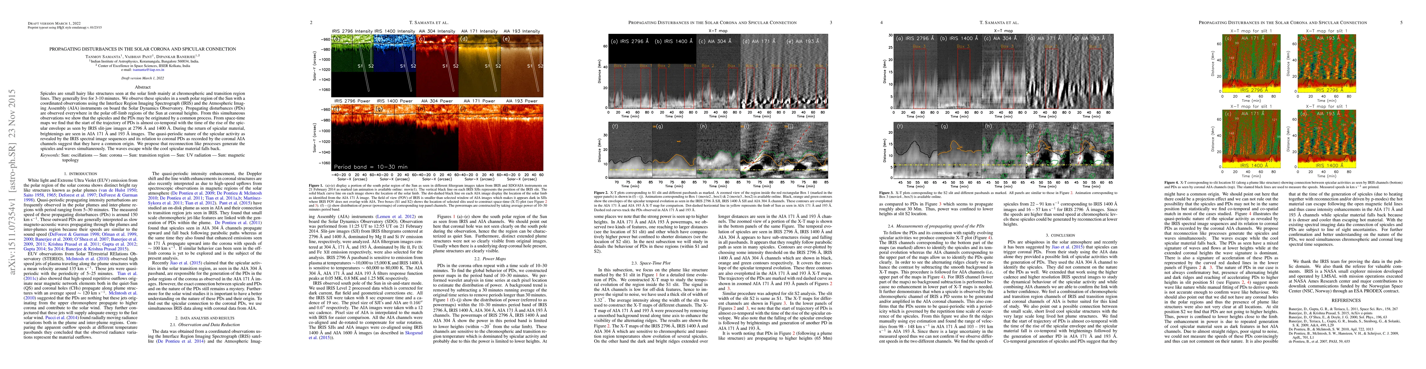 Spicules are small hairy like structures seen at the solar limb mainly at chromospheric and transition region lines. They generally live for 3-10 minutes. We observe these spicules in a south polar region of the Sun with a coordinated observations using the Interface Region Imaging Spectrograph (IRIS) and the Atmospheric Imaging Assembly (AIA) instruments on board the Solar Dynamics Observatory. Propagating disturbances (PDs) are observed everywhere in the polar off-limb regions of the Sun at coronal heights. From this simultaneous observations we show that the spicules and the PDs may be originated by a common process. From space-time maps we find that the start of the trajectory of PDs is almost co-temporal with the time of the rise of the spicular envelope as seen by IRIS slit-jaw images at 2796 {\deg}A and 1400 A{\deg} . During the return of spicular material, brightenings are seen in AIA 171 {\deg}A and 193 {\deg}A images. The quasi-periodic nature of the spicular activity as revealed by the IRIS spectral image sequences and its relation to coronal PDs as recorded by the coronal AIA channels suggest that they have a common origin. We propose that reconnection like processes generate the spicules and waves simultaneously. The waves escape while the cool spicular material falls back
