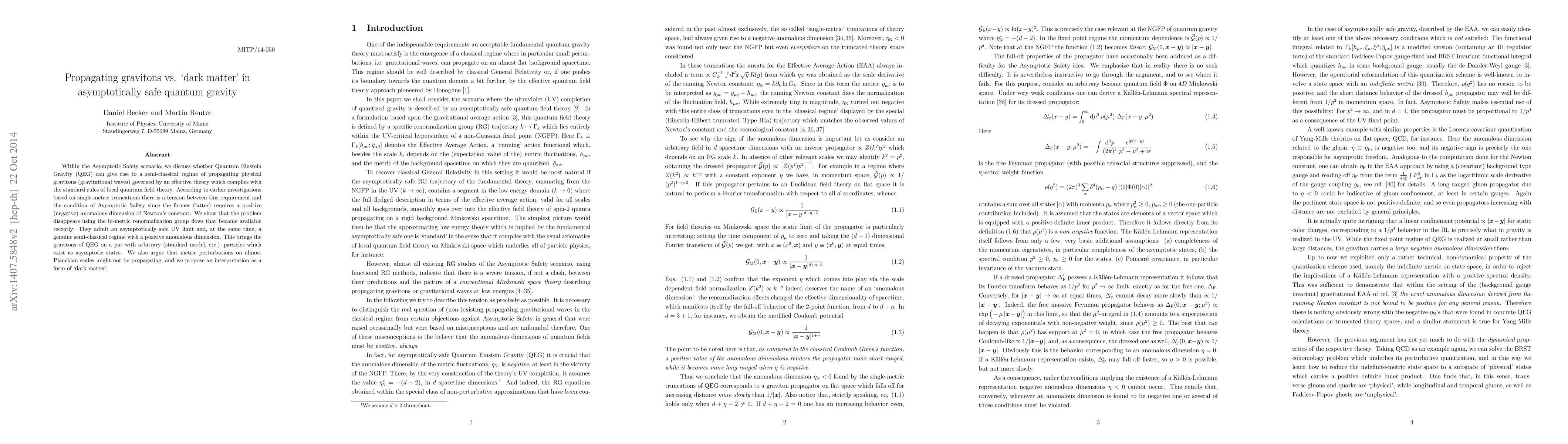 The paper introduces bi-metric renormalization group flows to reconcile the existence of propagating gravitons with the conditions of Asymptotic Safety, proposing a novel interpretation of non-propagating perturbations as dark matter.