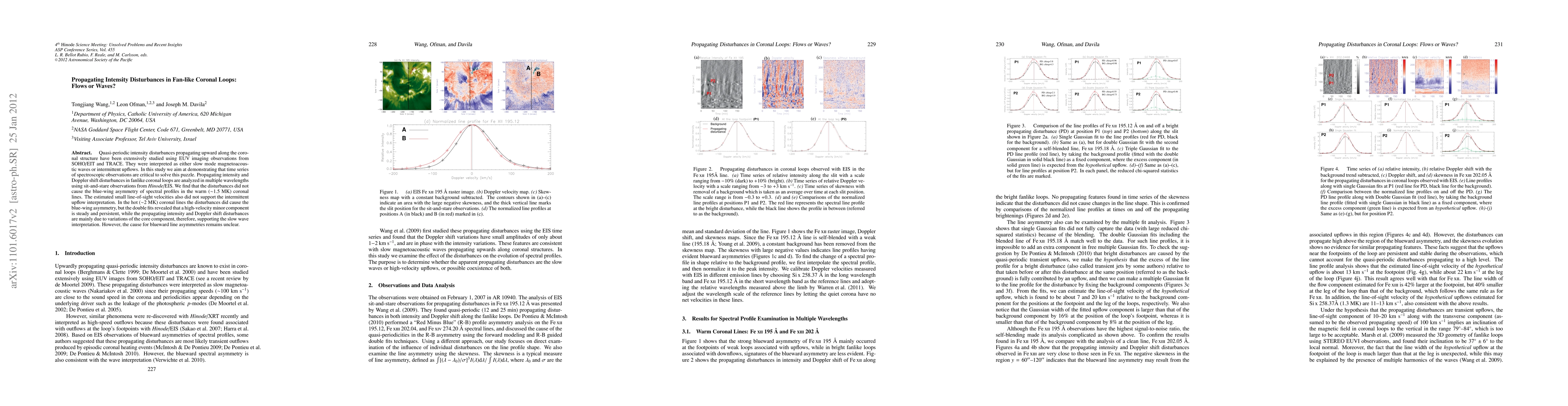 Quasi-periodic intensity disturbances propagating upward along the coronal structure have been extensively studied using EUV imaging observations from SOHO/EIT and TRACE. They were interpreted as either slow mode magnetoacoustic waves or intermittent upflows. In this study we aim at demonstrating that time series of spectroscopic observations are critical to solve this puzzle. Propagating intensity and Doppler shift disturbances in fanlike coronal loops are analyzed in multiple wavelengths using the sit-and-stare observations from Hinode/EIS. We find that the disturbances did not cause the blue-wing asymmetry of spectral profiles in the warm (~1.5 MK) coronal lines. The estimated small line-of-sight velocities also did not support the intermittent upflow interpretation. In the hot (~2 MK) coronal lines the disturbances did cause the blue-wing asymmetry, but the double fits revealed that a high-velocity minor component is steady and persistent, while the propagating intensity and Doppler shift disturbances are mainly due to variations of the core component, therefore, supporting the slow wave interpretation. However, the cause for blueward line asymmetries remains unclear.