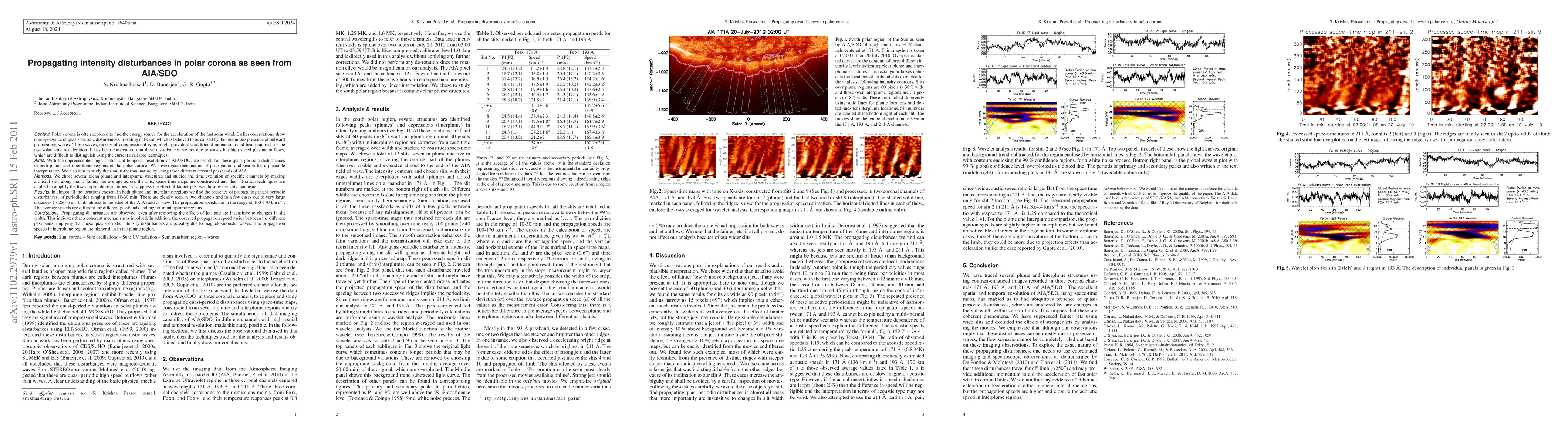 This study uses AIA/SDO data to investigate quasi-periodic disturbances in the polar corona, finding propagating waves with speeds of 100-170 km/s. The disturbances, observed in multiple coronal channels, suggest magneto-acoustic wave activity, with higher speeds in interplume regions.