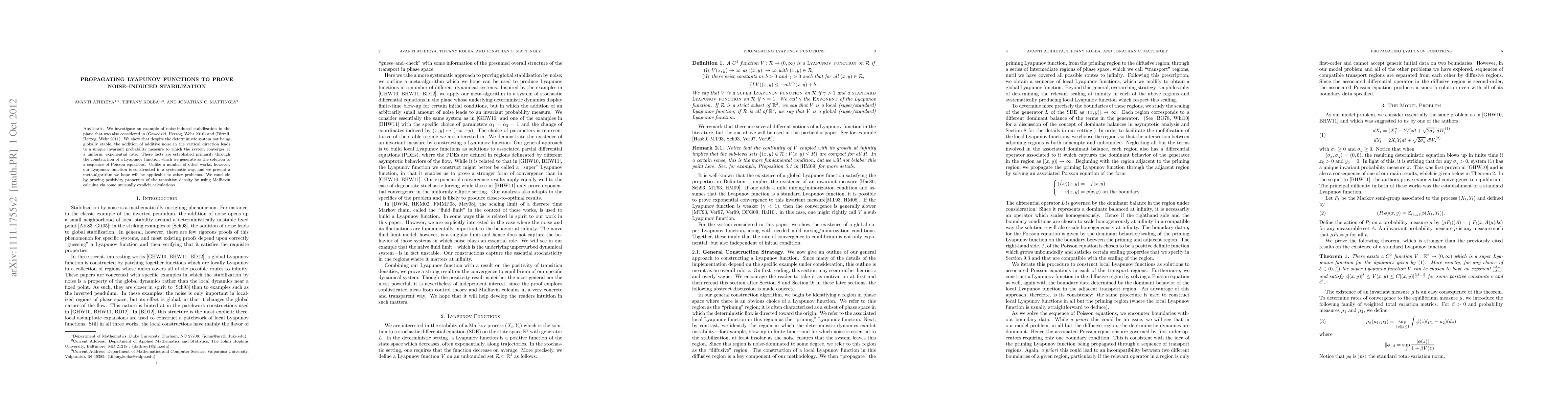 We investigate an example of noise-induced stabilization in the plane that was also considered in (Gawedzki, Herzog, Wehr 2010) and (Birrell, Herzog, Wehr 2011). We show that despite the deterministic system not being globally stable, the addition of additive noise in the vertical direction leads to a unique invariant probability measure to which the system converges at a uniform, exponential rate. These facts are established primarily through the construction of a Lyapunov function which we generate as the solution to a sequence of Poisson equations. Unlike a number of other works, however, our Lyapunov function is constructed in a systematic way, and we present a meta-algorithm we hope will be applicable to other problems. We conclude by proving positivity properties of the transition density by using Malliavin calculus via some unusually explicit calculations.