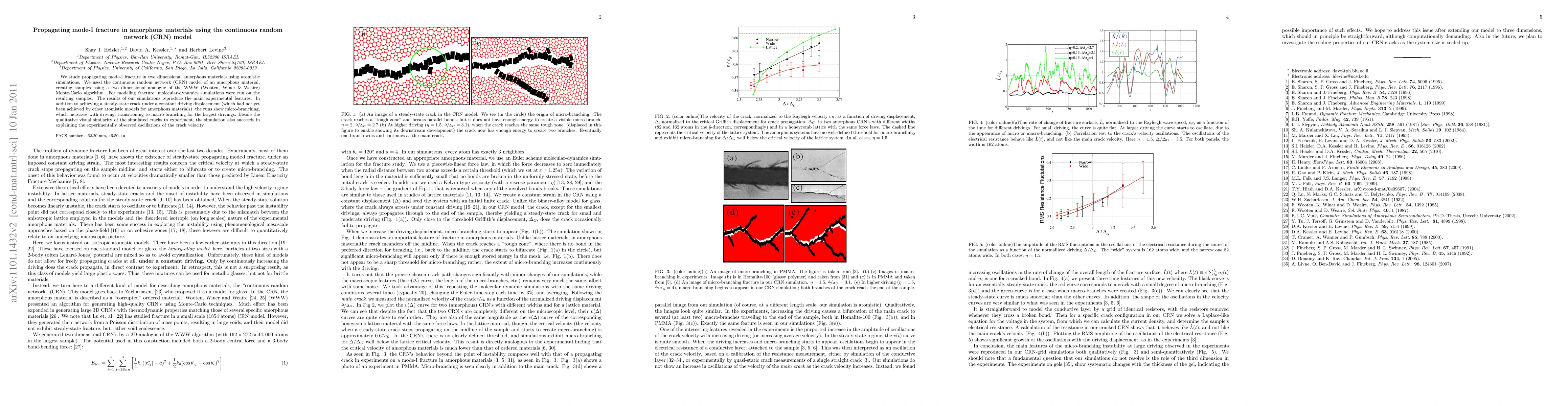 This paper investigates mode-I fracture in two-dimensional amorphous materials using atomistic simulations and the continuous random network (CRN) model. The study successfully reproduces experimental features, including steady-state crack propagation, micro-branching, and oscillations in crack velocity.