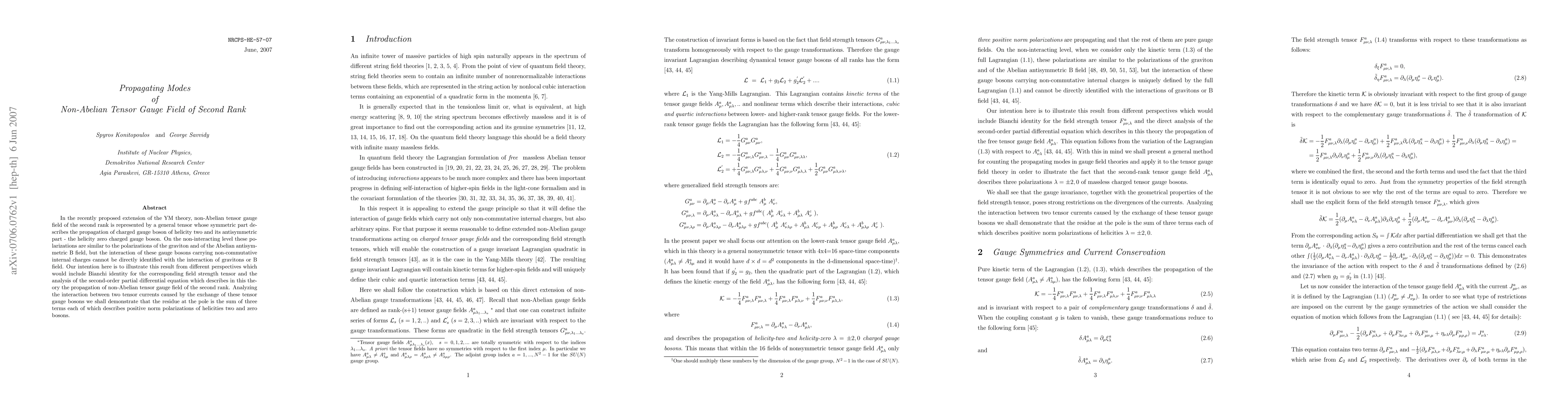 In the recently proposed extension of the YM theory, non-Abelian tensor gauge field of the second rank is represented by a general tensor whose symmetric part describes the propagation of charged gauge boson of helicity two and its antisymmetric part - the helicity zero charged gauge boson. On the non-interacting level these polarizations are similar to the polarizations of the graviton and of the Abelian antisymmetric B field, but the interaction of these gauge bosons carrying non-commutative internal charges cannot be directly identified with the interaction of gravitons or B field. Our intention here is to illustrate this result from different perspectives which would include Bianchi identity for the corresponding field strength tensor and the analysis of the second-order partial differential equation which describes in this theory the propagation of non-Abelian tensor gauge field of the second rank.