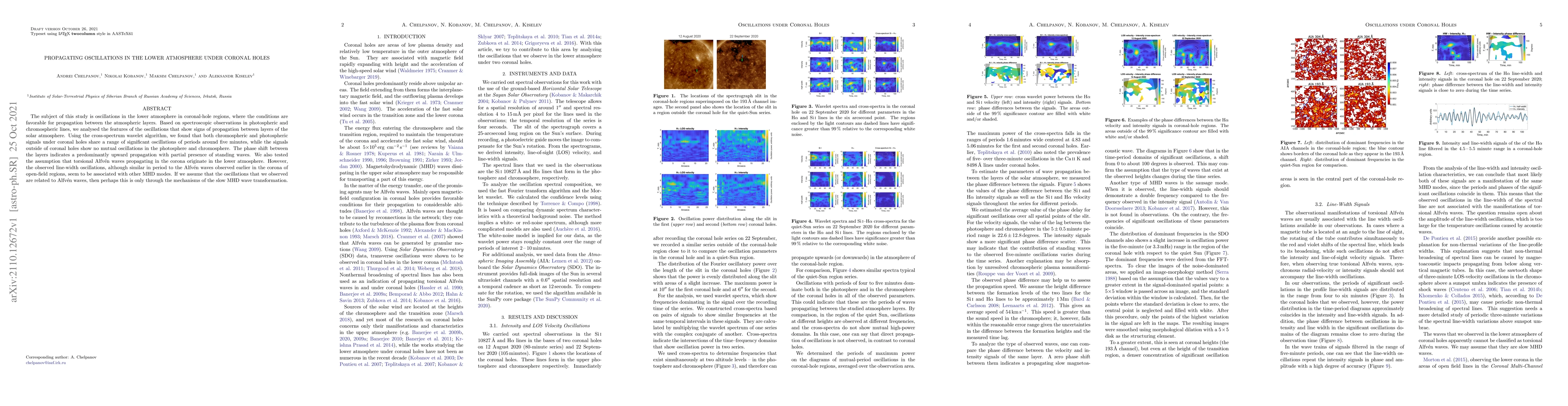 The subject of this study is oscillations in the lower atmosphere in coronal-hole regions, where the conditions are favorable for propagation between the atmospheric layers. Based on spectroscopic observations in photospheric and chromospheric lines, we analysed the features of the oscillations that show signs of propagation between layers of the solar atmosphere. Using the cross-spectrum wavelet algorithm, we found that both chromospheric and photospheric signals under coronal holes share a range of significant oscillations of periods around five minutes, while the signals outside of coronal holes show no mutual oscillations in the photosphere and chromosphere. The phase shift between the layers indicates a predominantly upward propagation with partial presence of standing waves. We also tested the assumption that torsional Alfv\'en waves propagating in the corona originate in the lower atmosphere. However, the observed line-width oscillations, although similar in period to the Alfv\'en waves observed earlier in the corona of open-field regions, seem to be associated with other MHD modes. If we assume that the oscillations that we observed are related to Alfv\'en waves, then perhaps this is only through the mechanisms of the slow MHD wave transformation.