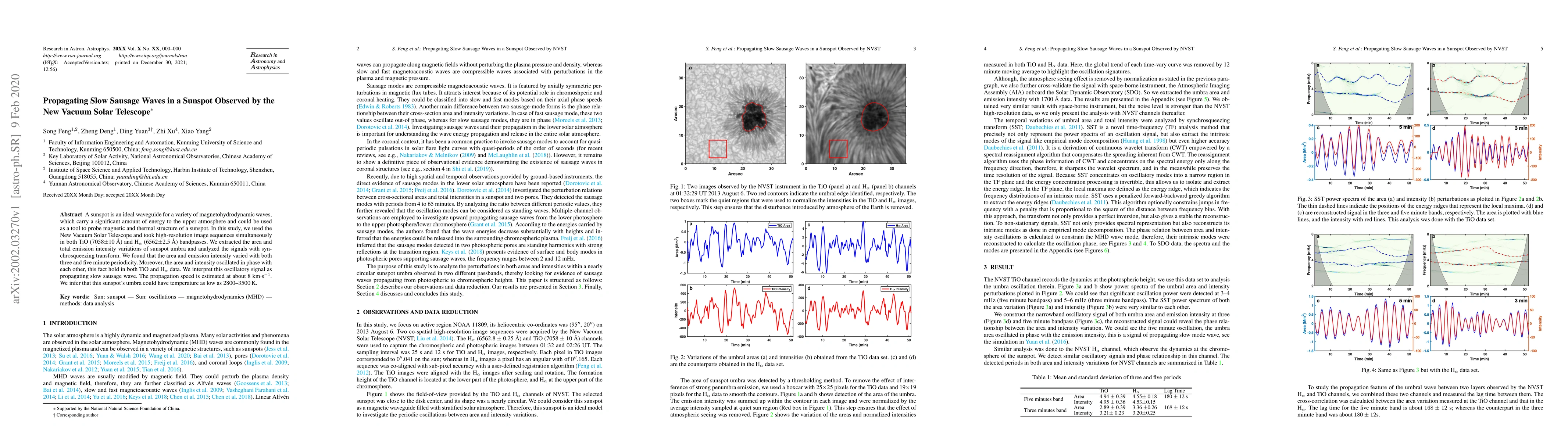 A sunspot is an ideal waveguide for a variety of magnetohydrodynamic waves, which carry a significant amount of energy to the upper atmosphere and could be used as a tool to probe magnetic and thermal structure of a sunspot. In this study, we used the New Vacuum Solar Telescope and took high-resolution image sequences simultaneously in both TiO (7058$\pm$10 \AA) and H$_\alpha$ (6562$\pm$2.5 \AA) bandpasses. We extracted the area and total emission intensity variations of sunspot umbra and analyzed the signals with synchrosqueezing transform. We found that the area and emission intensity varied with both three and five minute periodicity. Moreover, the area and intensity oscillated in phase with each other, this fact hold in both TiO and H$_\alpha$ data. We interpret this oscillatory signal as propagating slow sausage wave. The propagation speed is estimated at about 8 km$\cdot$s$^{-1}$. We infer that this sunspot's umbra could have temperature as low as 2800--3500 K.