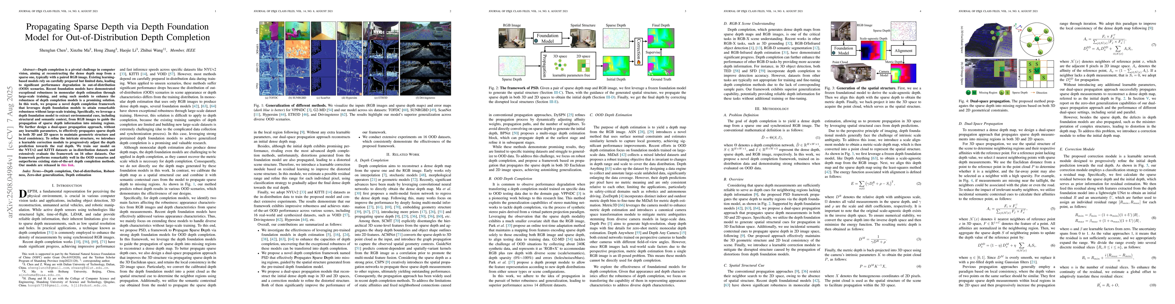 Depth completion is a pivotal challenge in computer vision, aiming at reconstructing the dense depth map from a sparse one, typically with a paired RGB image. Existing learning based models rely on carefully prepared but limited data, leading to significant performance degradation in out-of-distribution (OOD) scenarios. Recent foundation models have demonstrated exceptional robustness in monocular depth estimation through large-scale training, and using such models to enhance the robustness of depth completion models is a promising solution. In this work, we propose a novel depth completion framework that leverages depth foundation models to attain remarkable robustness without large-scale training. Specifically, we leverage a depth foundation model to extract environmental cues, including structural and semantic context, from RGB images to guide the propagation of sparse depth information into missing regions. We further design a dual-space propagation approach, without any learnable parameters, to effectively propagates sparse depth in both 3D and 2D spaces to maintain geometric structure and local consistency. To refine the intricate structure, we introduce a learnable correction module to progressively adjust the depth prediction towards the real depth. We train our model on the NYUv2 and KITTI datasets as in-distribution datasets and extensively evaluate the framework on 16 other datasets. Our framework performs remarkably well in the OOD scenarios and outperforms existing state-of-the-art depth completion methods. Our models are released in https://github.com/shenglunch/PSD.