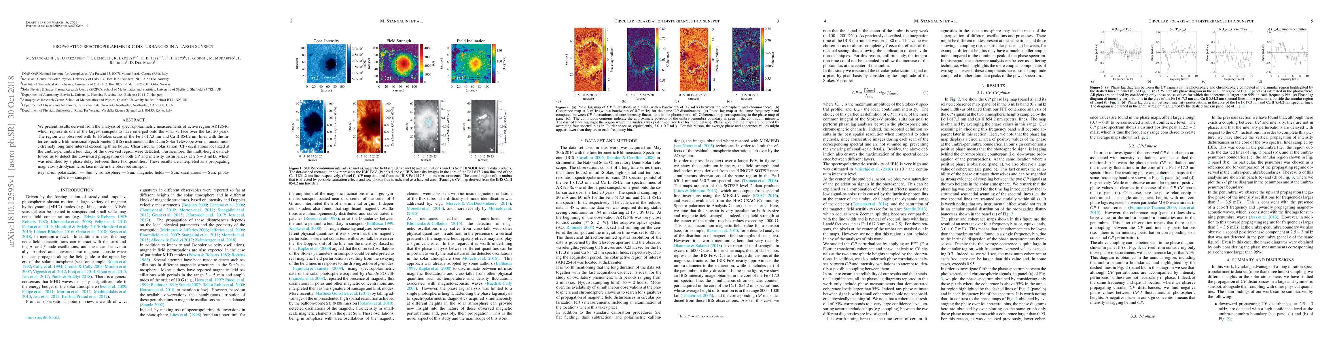 We present results derived from the analysis of spectropolarimetric measurements of active region AR12546, which represents one of the largest sunspots to have emerged onto the solar surface over the last $20$ years. The region was observed with full-Stokes scans of the Fe I 617.3 nm and Ca II 854.2 nm lines with the Interferometric BIdimensional Spectrometer (IBIS) instrument at the Dunn Solar Telescope over an uncommon, extremely long time interval exceeding three hours. Clear circular polarization (CP) oscillations localized at the umbra-penumbra boundary of the observed region were detected. Furthermore, the multi-height data allowed us to detect the downward propagation of both CP and intensity disturbances at $2.5-3$~mHz, which was identified by a phase delay between these two quantities. These results are interpreted as a propagating magneto-hydrodynamic surface mode in the observed sunspot.