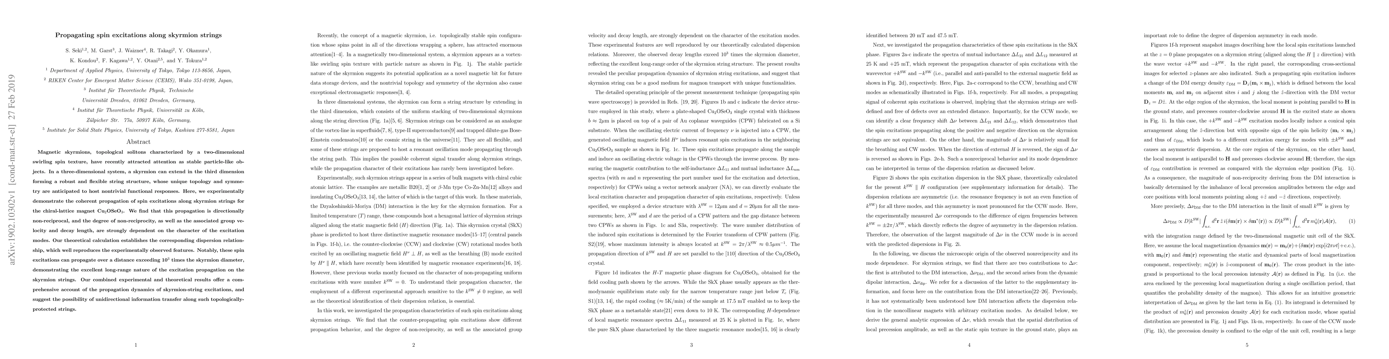 This paper experimentally demonstrates the coherent, directionally non-reciprocal propagation of spin excitations along skyrmion strings in Cu2OSeO3, revealing strong dependence on excitation modes and a long-range propagation exceeding 10^3 times the skyrmion diameter, supported by theoretical calculations.