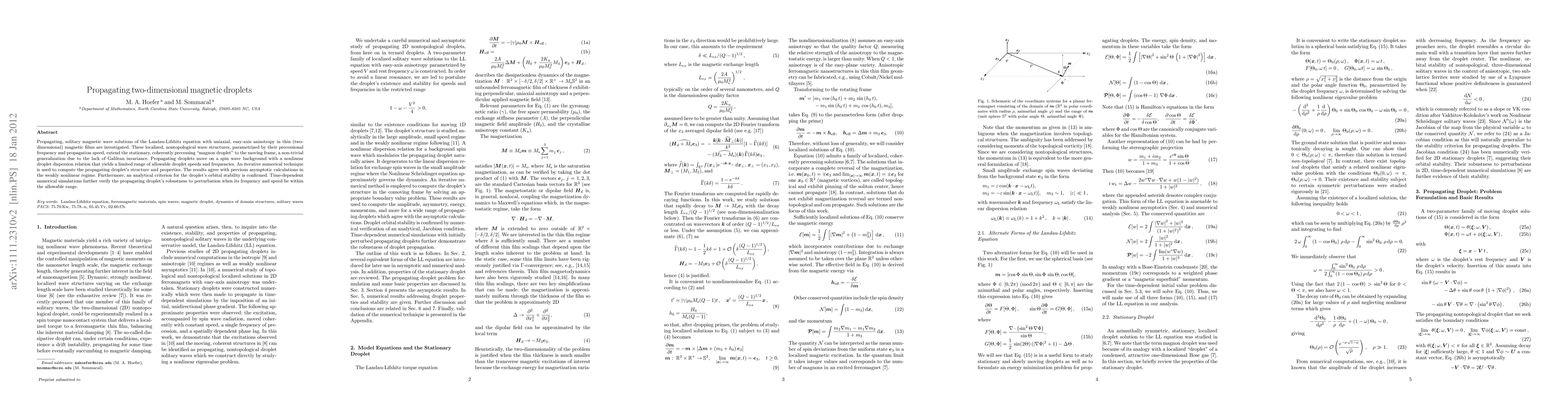 Propagating, solitary magnetic wave solutions of the Landau-Lifshitz equation with uniaxial, easy-axis anisotropy in thin (two-dimensional) magnetic films are investigated. These localized, nontopological wave structures, parametrized by their precessional frequency and propagation speed, extend the stationary, coherently precessing "magnon droplet" to the moving frame, a non-trivial generalization due to the lack of Galilean invariance. Propagating droplets move on a spin wave background with a nonlinear droplet dispersion relation that yields a limited range of allowable droplet speeds and frequencies. An iterative numerical technique is used to compute the propagating droplet's structure and properties. The results agree with previous asymptotic calculations in the weakly nonlinear regime. Furthermore, an analytical criterion for the droplet's orbital stability is confirmed. Time-dependent numerical simulations further verify the propagating droplet's robustness to perturbation when its frequency and speed lie within the allowable range.