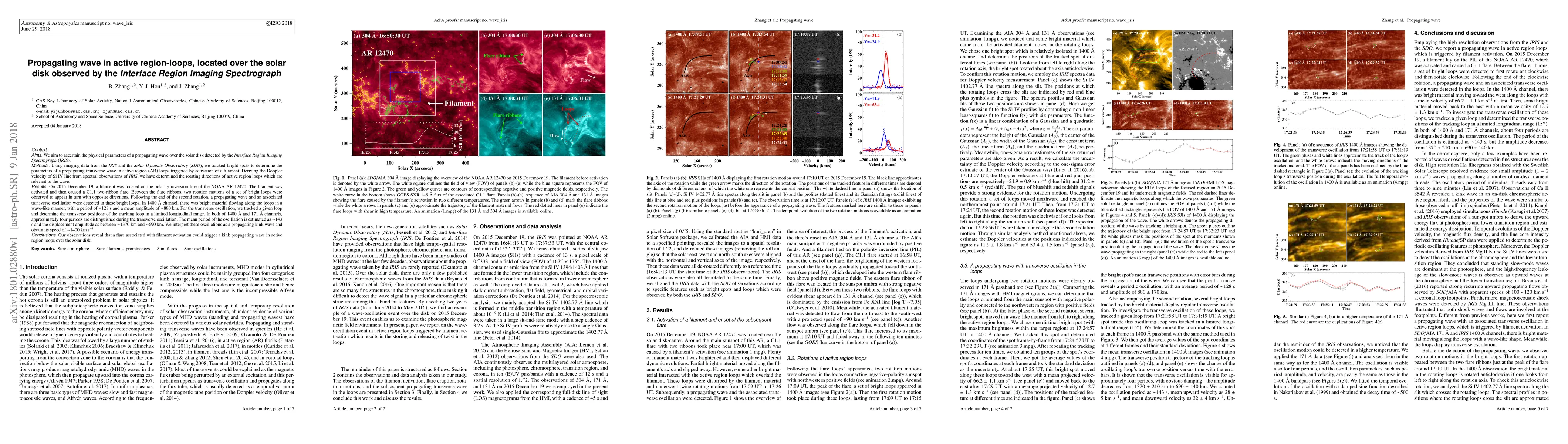 We aim to ascertain the physical parameters of a propagating wave over the solar disk detected by the Interface Region Imaging Spectrograph (IRIS). Using imaging data from the IRIS and the Solar Dynamic Observatory (SDO), we tracked bright spots to determine the parameters of a propagating transverse wave in active region (AR) loops triggered by activation of a filament. Deriving the Doppler velocity of Si IV line from spectral observations of IRIS, we have determined the rotating directions of active region loops which are relevant to the wave. On 2015 December 19, a filament was located on the polarity inversion line of the NOAA AR 12470. The filament was activated and then caused a C 1.1 two-ribbon flare. Between the flare ribbons, two rotation motions of a set of bright loops were observed to appear in turn with opposite directions. Following the end of the second rotation, a propagating wave and an associated transverse oscillation were detected in these bright loops. In 1400 A channel, there was bright material flowing along the loops in a wave-like manner, with a period of ~128 s and a mean amplitude of ~880 km. For the transverse oscillation, we tracked a given loop and determine the transverse positions of the tracking loop in a limited longitudinal range. In both of 1400 A and 171 A channels, approximately four periods are distinguished during the transverse oscillation. The mean period of the oscillation is estimated as ~143 s and the displacement amplitude as between ~1370 km and ~690 km. We interpret these oscillations as a propagating kink wave and obtain its speed of ~1400 km s-1. Our observations reveal that a flare associated with filament activation could trigger a kink propagating wave in active region loops over the solar disk.