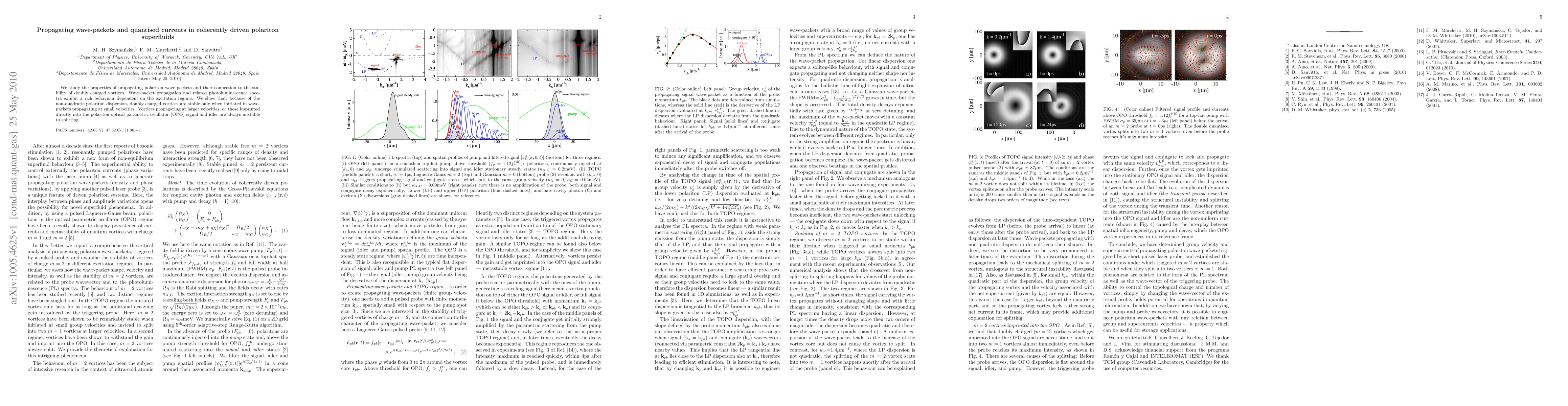 We study the properties of propagating polariton wave-packets and their connection to the stability of doubly charged vortices. Wave-packet propagation and related photoluminescence spectra exhibit a rich behaviour dependent on the excitation regime. We show that, because of the non-quadratic polariton dispersion, doubly charged vortices are stable only when initiated in wave-packets propagating at small velocities. Vortices propagating at larger velocities, or those imprinted directly into the polariton optical parametric oscillator (OPO) signal and idler are always unstable to splitting.