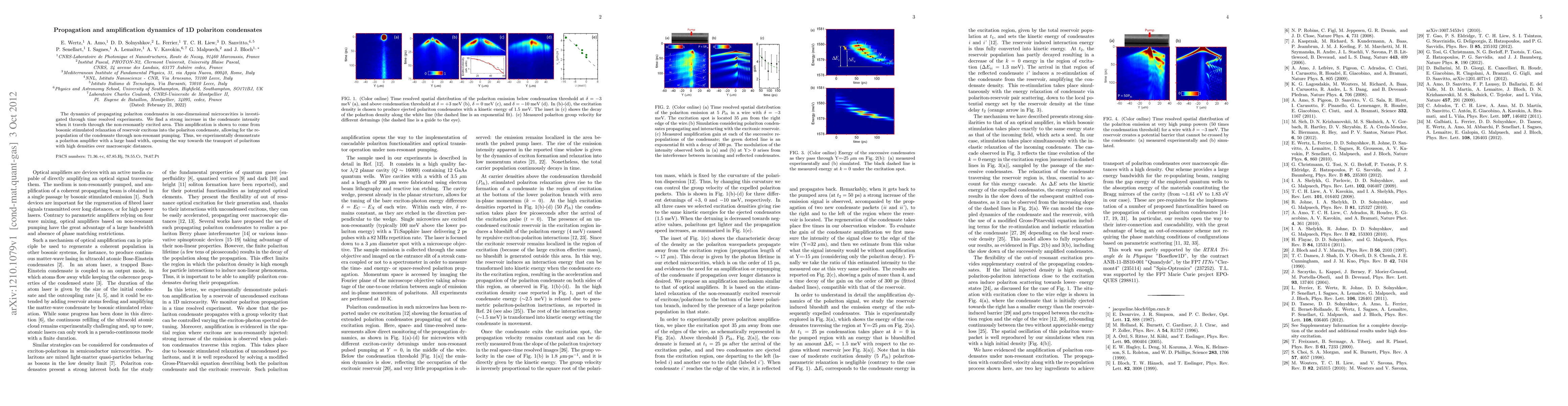 This study investigates the propagation and amplification of 1D polariton condensates in microcavities, revealing significant intensity increase through bosonic stimulated relaxation. The findings demonstrate a polariton amplifier with broad bandwidth, enabling high-density polariton transport over long distances.