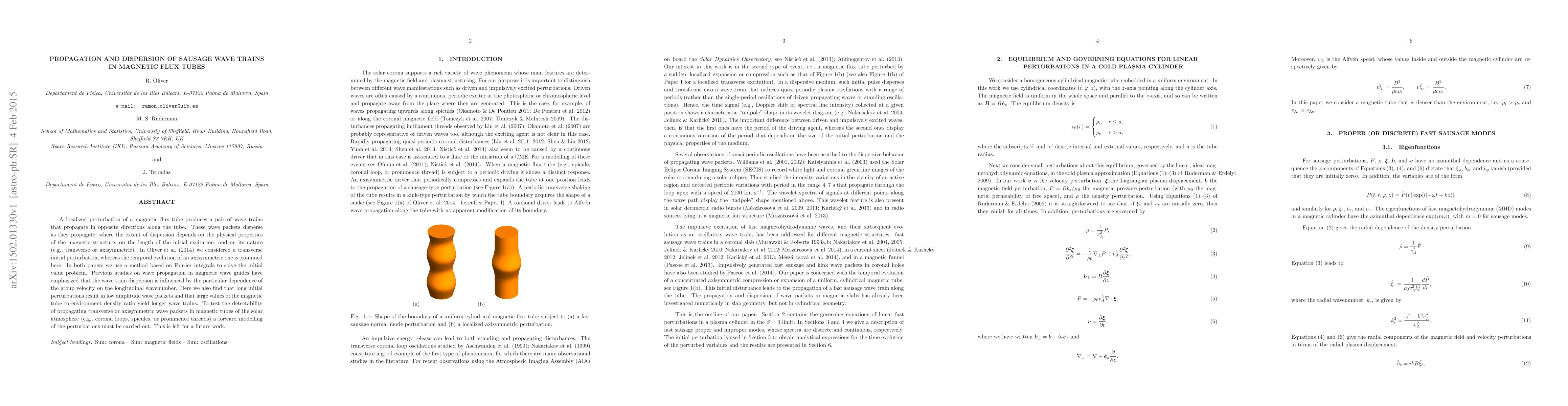 This paper investigates the propagation and dispersion of sausage wave trains in magnetic flux tubes, focusing on the temporal evolution of axisymmetric initial perturbations. It finds that dispersion is influenced by the magnetic structure's properties and the initial perturbation's length and nature, with long initial perturbations resulting in lower amplitude wave packets.