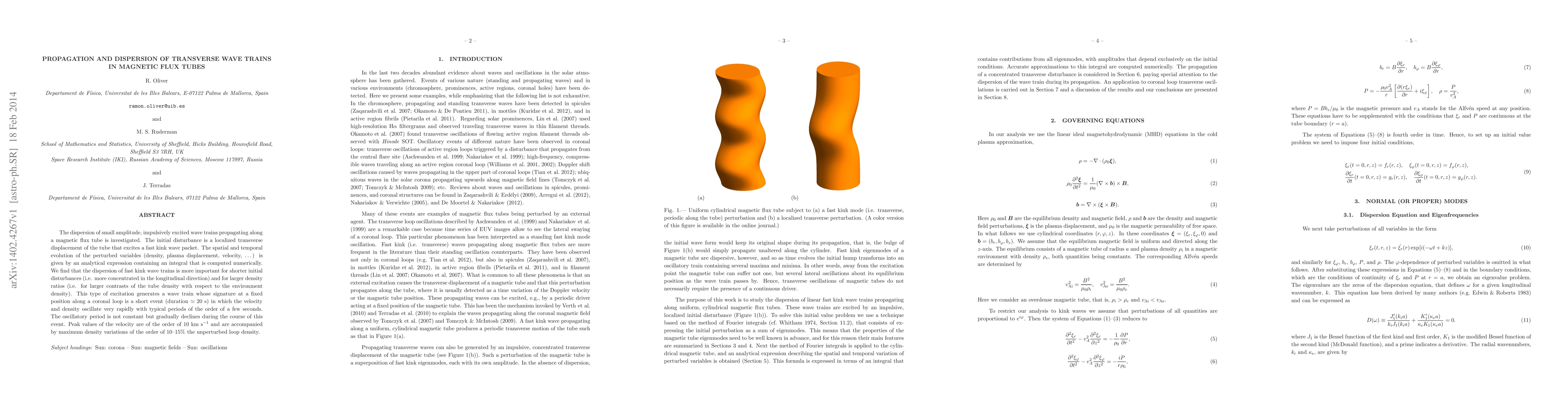 This paper investigates the dispersion of transverse wave trains in magnetic flux tubes, finding that shorter initial disturbances and larger density contrasts lead to more pronounced dispersion. The resulting wave trains exhibit rapid oscillations in velocity and density with periods declining over time, peaking at around 10 km/s and 10-15% density variation.