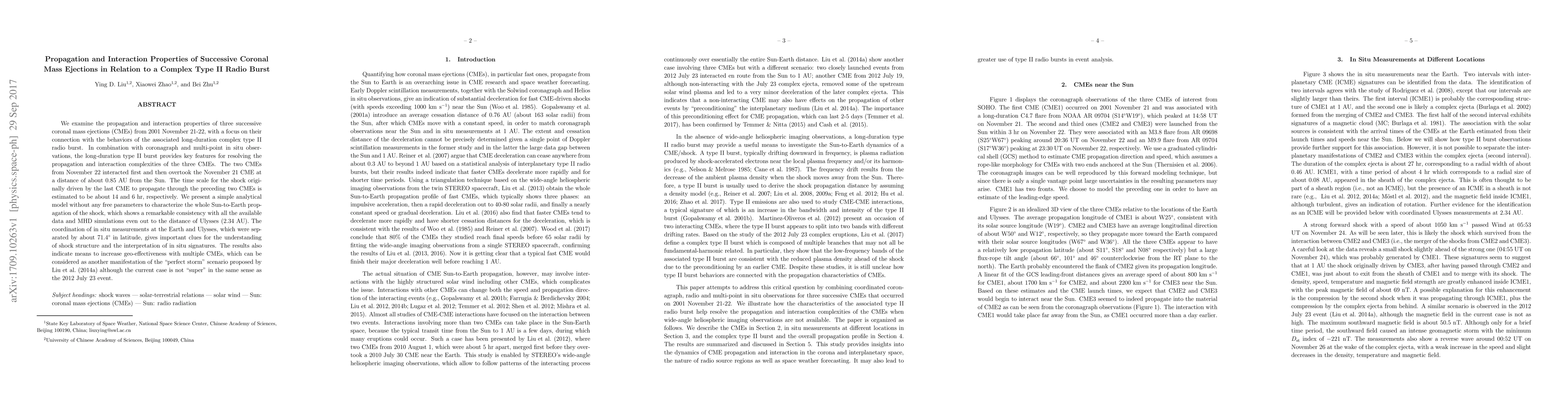 We examine the propagation and interaction properties of three successive coronal mass ejections (CMEs) from 2001 November 21-22, with a focus on their connection with the behaviors of the associated long-duration complex type II radio burst. In combination with coronagraph and multi-point in situ observations, the long-duration type II burst provides key features for resolving the propagation and interaction complexities of the three CMEs. The two CMEs from November 22 interacted first and then overtook the November 21 CME at a distance of about 0.85 AU from the Sun. The time scale for the shock originally driven by the last CME to propagate through the preceding two CMEs is estimated to be about 14 and 6 hr, respectively. We present a simple analytical model without any free parameters to characterize the whole Sun-to-Earth propagation of the shock, which shows a remarkable consistency with all the available data and MHD simulations even out to the distance of Ulysses (2.34 AU). The coordination of in situ measurements at the Earth and Ulysses, which were separated by about $71.4^{\circ}$ in latitude, gives important clues for the understanding of shock structure and the interpretation of in situ signatures. The results also indicate means to increase geo-effectiveness with multiple CMEs, which can be considered as another manifestation of the "perfect storm" scenario proposed by [liu14a] although the current case is not "super" in the same sense as the 2012 July 23 event.