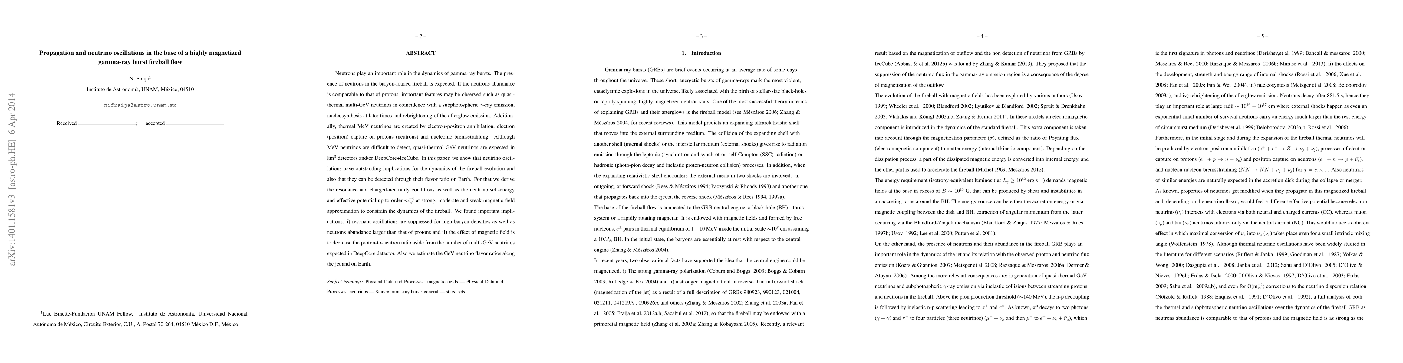 Neutrons play an important role in the dynamics of gamma-ray bursts. The presence of neutrons in the baryon-loaded fireball is expected. If the neutrons abundance is comparable to that of protons, important features may be observed such as quasi-thermal multi-GeV neutrinos in coincidence with a subphotospheric $\gamma$-ray emission, nucleosynthesis at later times and rebrightening of the afterglow emission. Additionally, thermal MeV neutrinos are created by electron-positron annihilation, electron (positron) capture on protons (neutrons) and nucleonic bremsstrahlung. Although MeV neutrinos are difficult to detect, quasi-thermal GeV neutrinos are expected in km$^3$ detectors and/or DeepCore+IceCube. In this paper, we show that neutrino oscillations have outstanding implications for the dynamics of the fireball evolution and also that they can be detected through their flavor ratio on Earth. For that we derive the resonance and charged-neutrality conditions as well as the neutrino self-energy and effective potential up to order $m_W^{-4}$ at strong, moderate and weak magnetic field approximation to constrain the dynamics of the fireball. We found important implications: i) resonant oscillations are suppressed for high baryon densities as well as neutrons abundance larger than that of protons and ii) the effect of magnetic field is to decrease the proton-to-neutron ratio aside from the number of multi-GeV neutrinos expected in DeepCore detector. Also we estimate the GeV neutrino flavor ratios along the jet and on Earth.