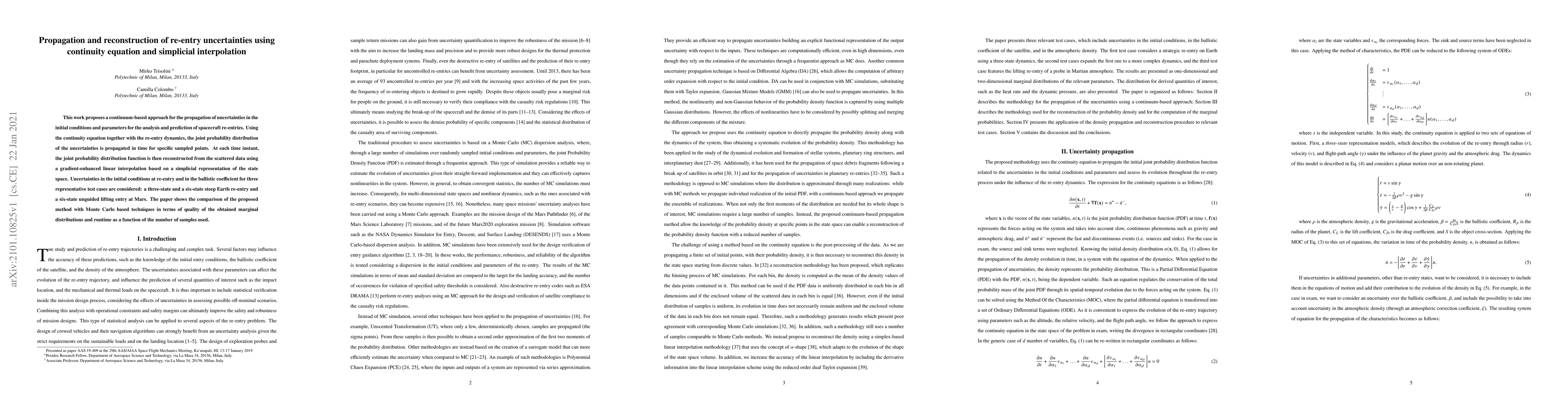 This paper introduces a continuum-based method for propagating uncertainties in spacecraft re-entry dynamics using the continuity equation and simplicial interpolation for probability distribution reconstruction. It compares the proposed method's performance against Monte Carlo techniques in terms of marginal distribution quality and computational efficiency.